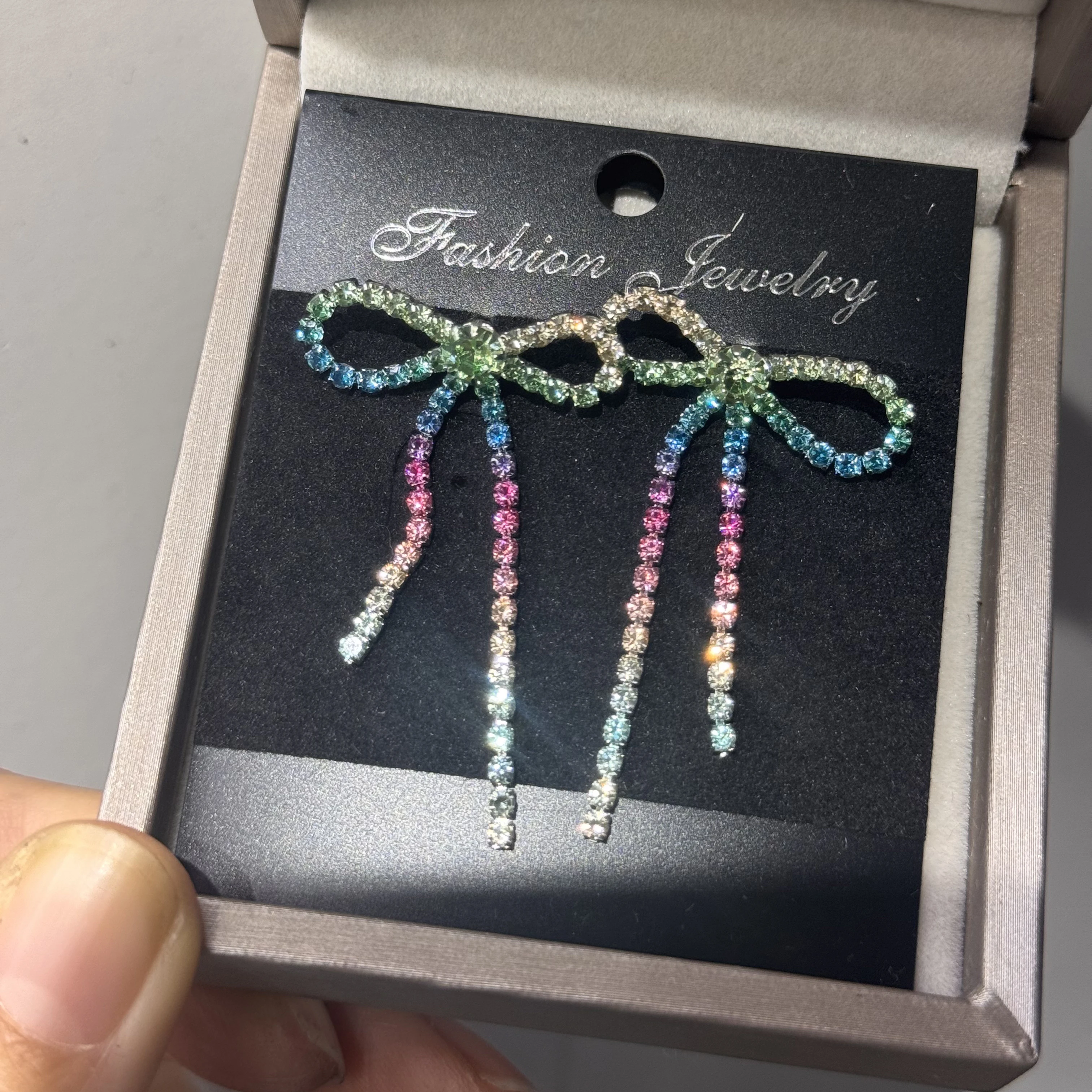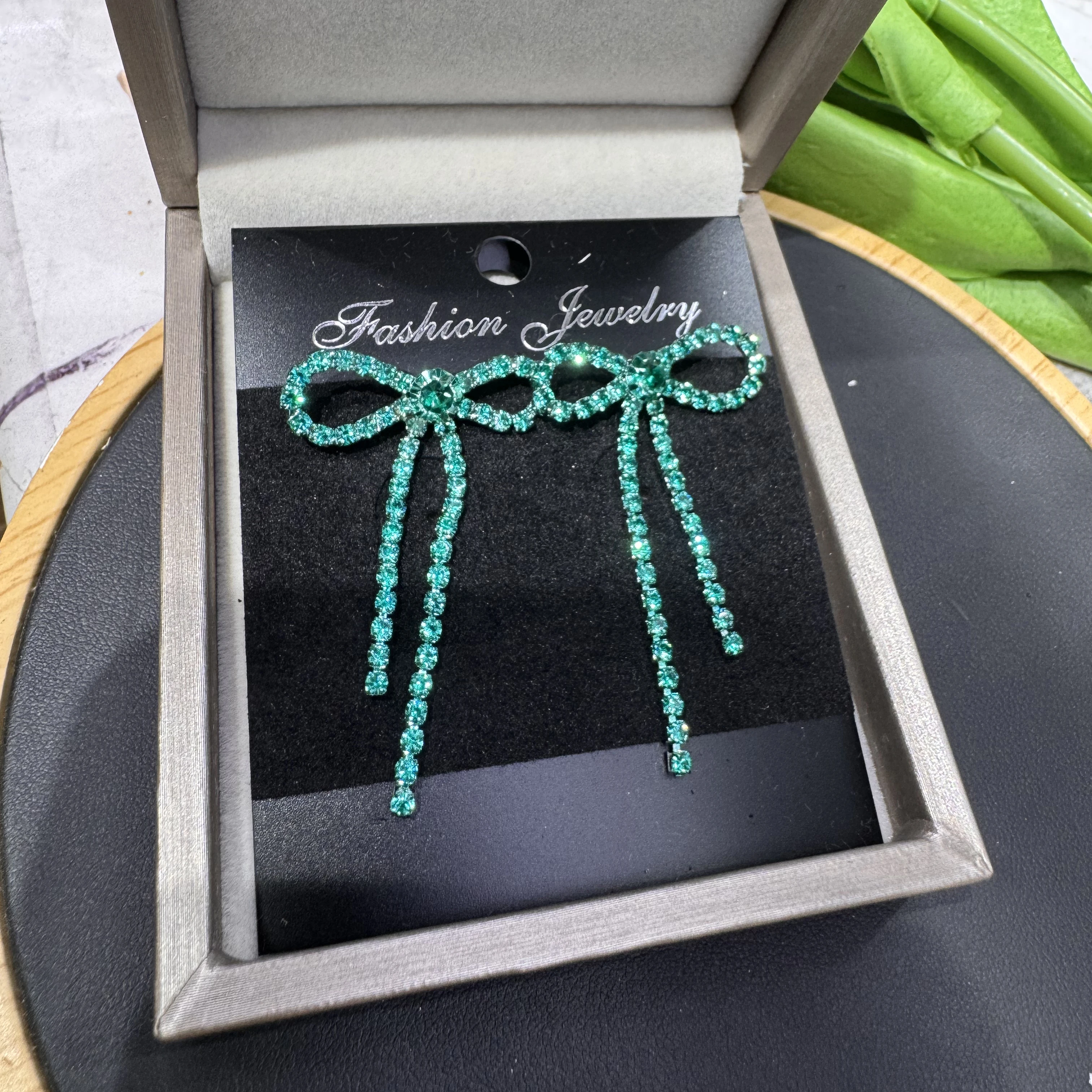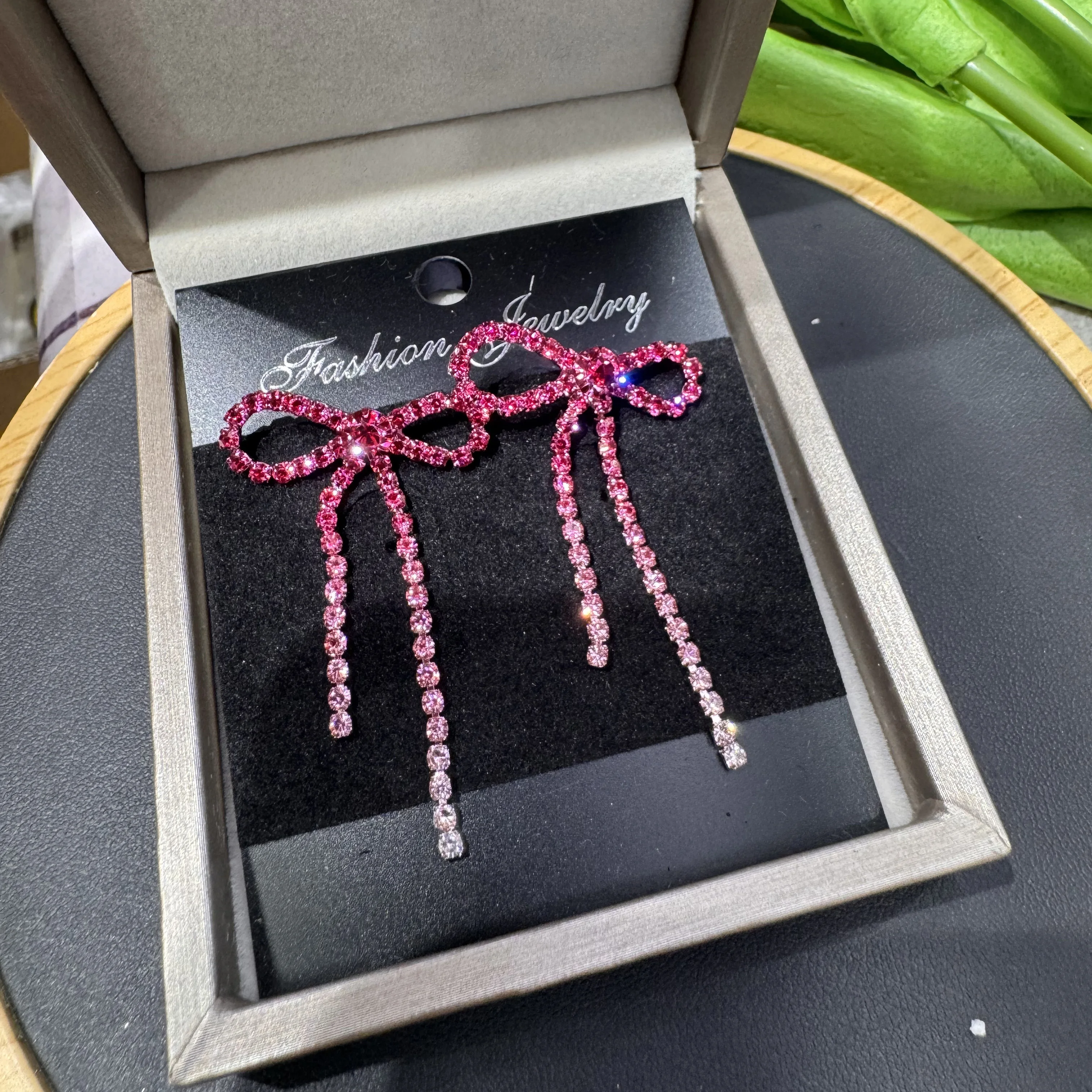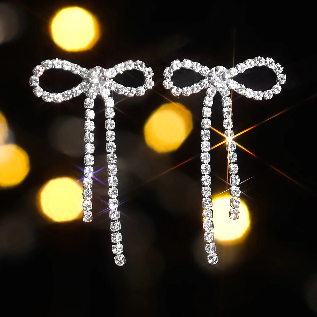colourful Bow Earrings for Women Rhinestone Long Tassel Earrings Black Stainless Steel Dangle Earrings Cute Sparkly Jewelry