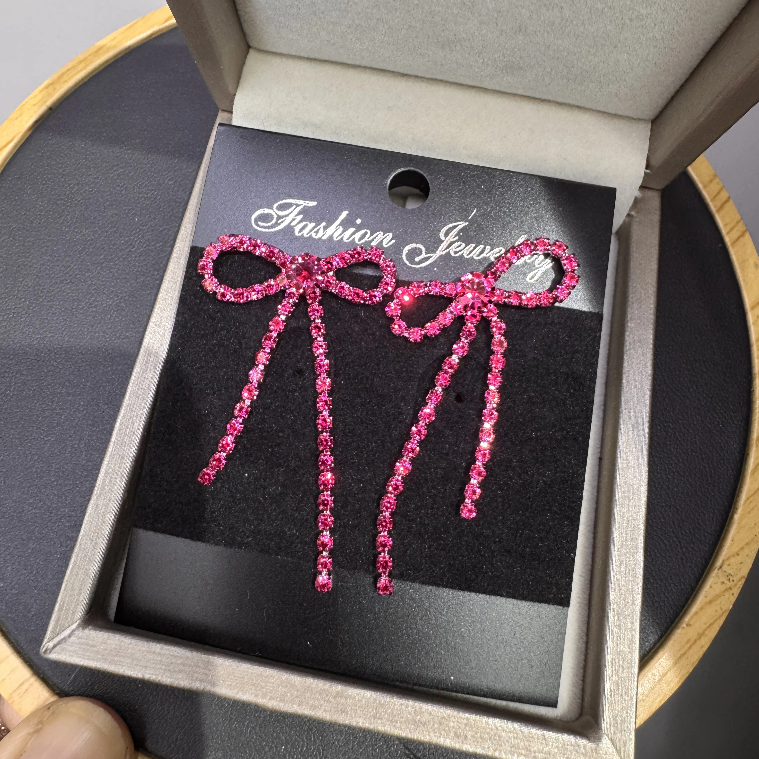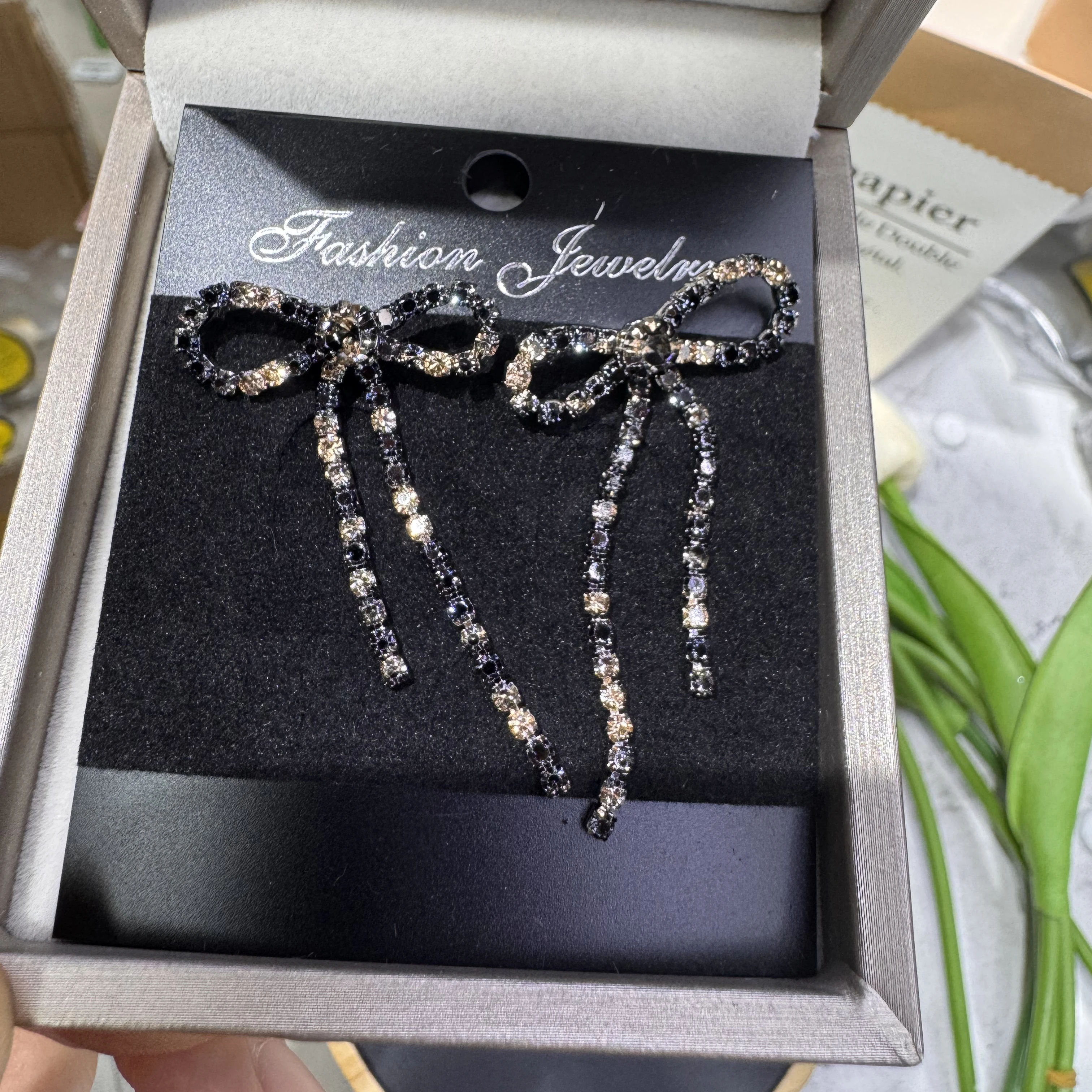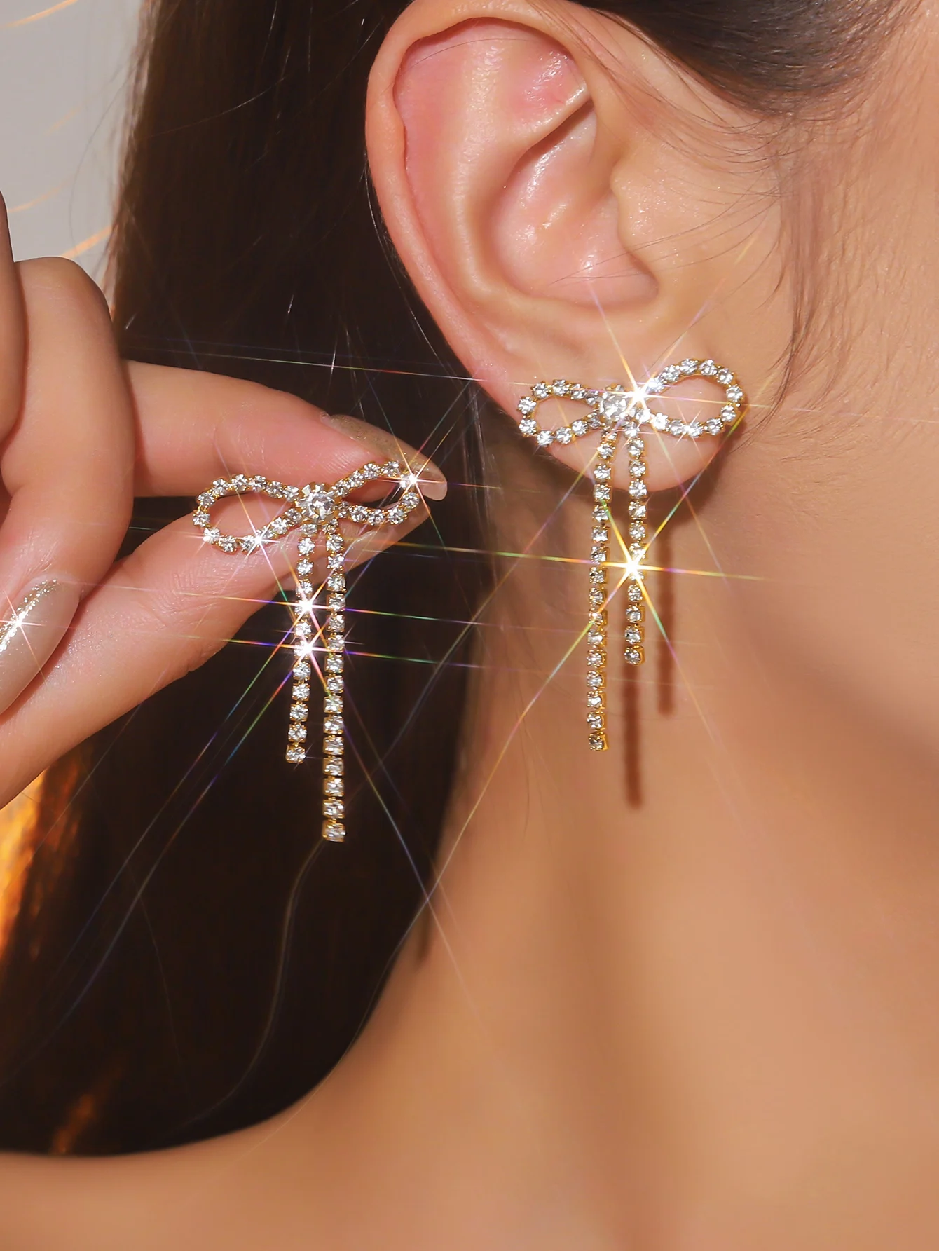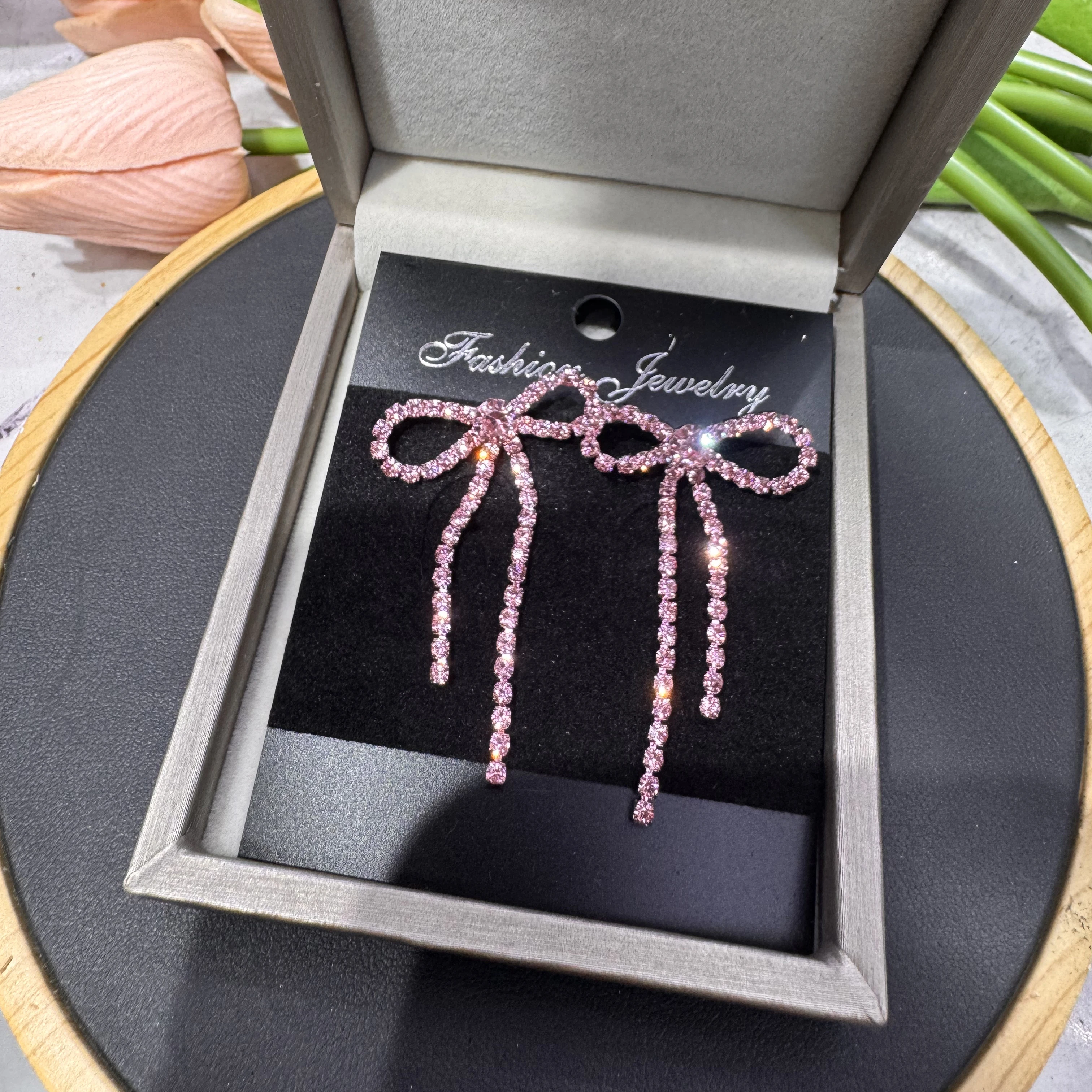 colourful Bow Earrings for Women Rhinestone Long Tassel Earrings Black Stainless Steel Dangle Earrings Cute Sparkly Jewelry