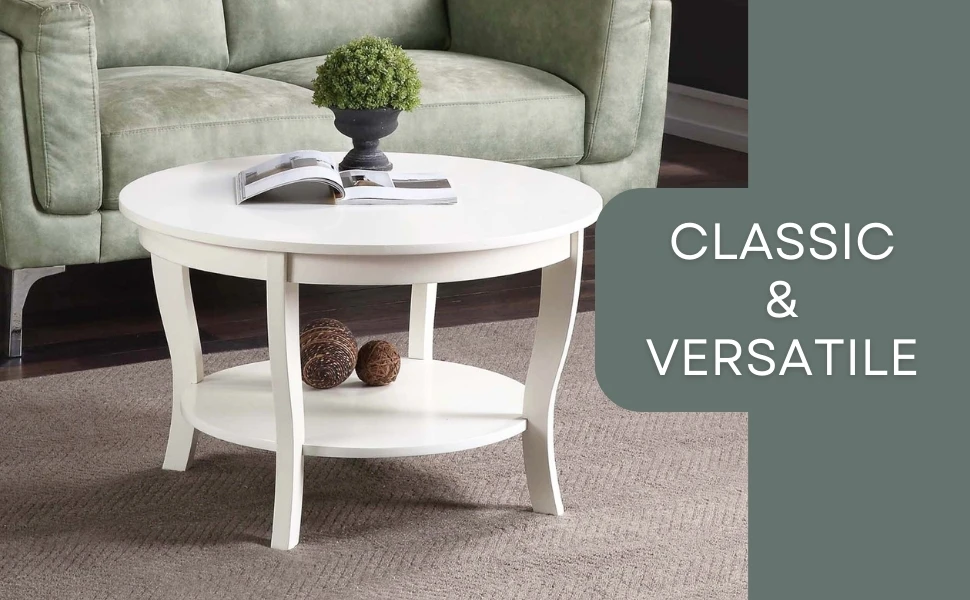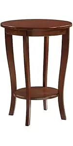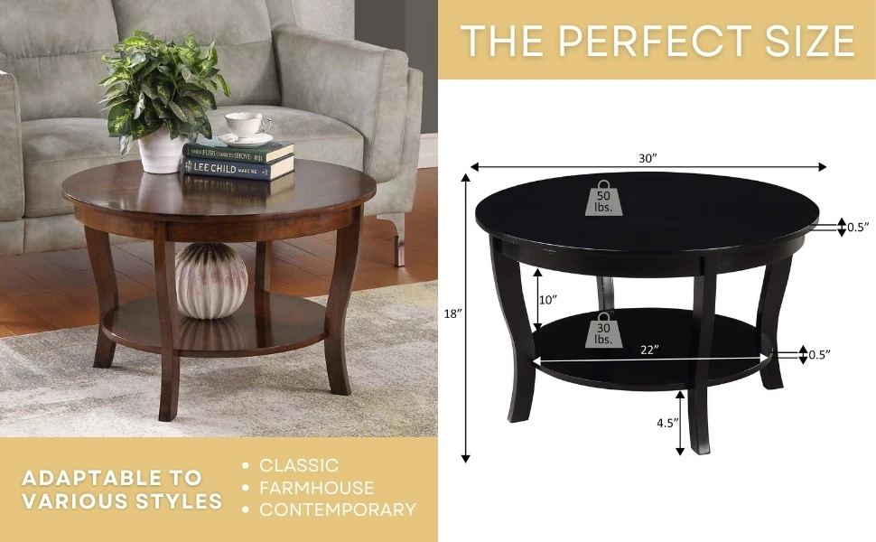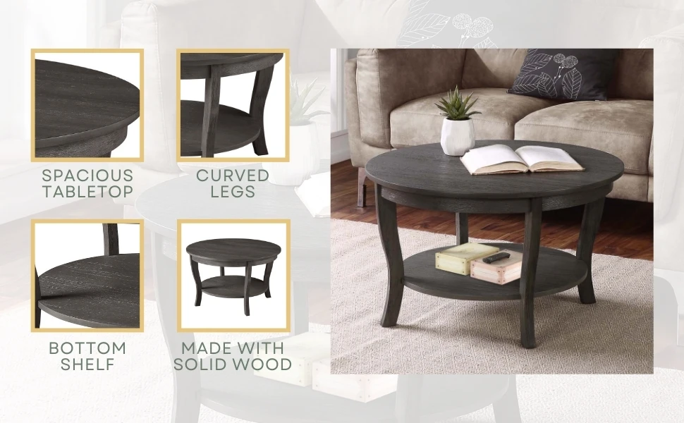 Bring home the classic design American Heritage Round Coffee Table with Shelf by Convenience Concepts. Its round silhouette features slightly curved legs along with a bottom shelf. With two circular spacious tiers; there is plenty of room to display beautiful centerpieces or entertainment essentials. This rich veneer-finished coffee table is crafted from manufactured wood and the sturdy legs are engineered from solid rubberwood; making this piece durable and easy maintenance. Assembly is simple and requires only 3 easy steps. Available in multiple finishes; this circle table will become a staple in your home right away. Pair with additional items from the American Heritage Collection by Convenience Concepts; each sold separately.