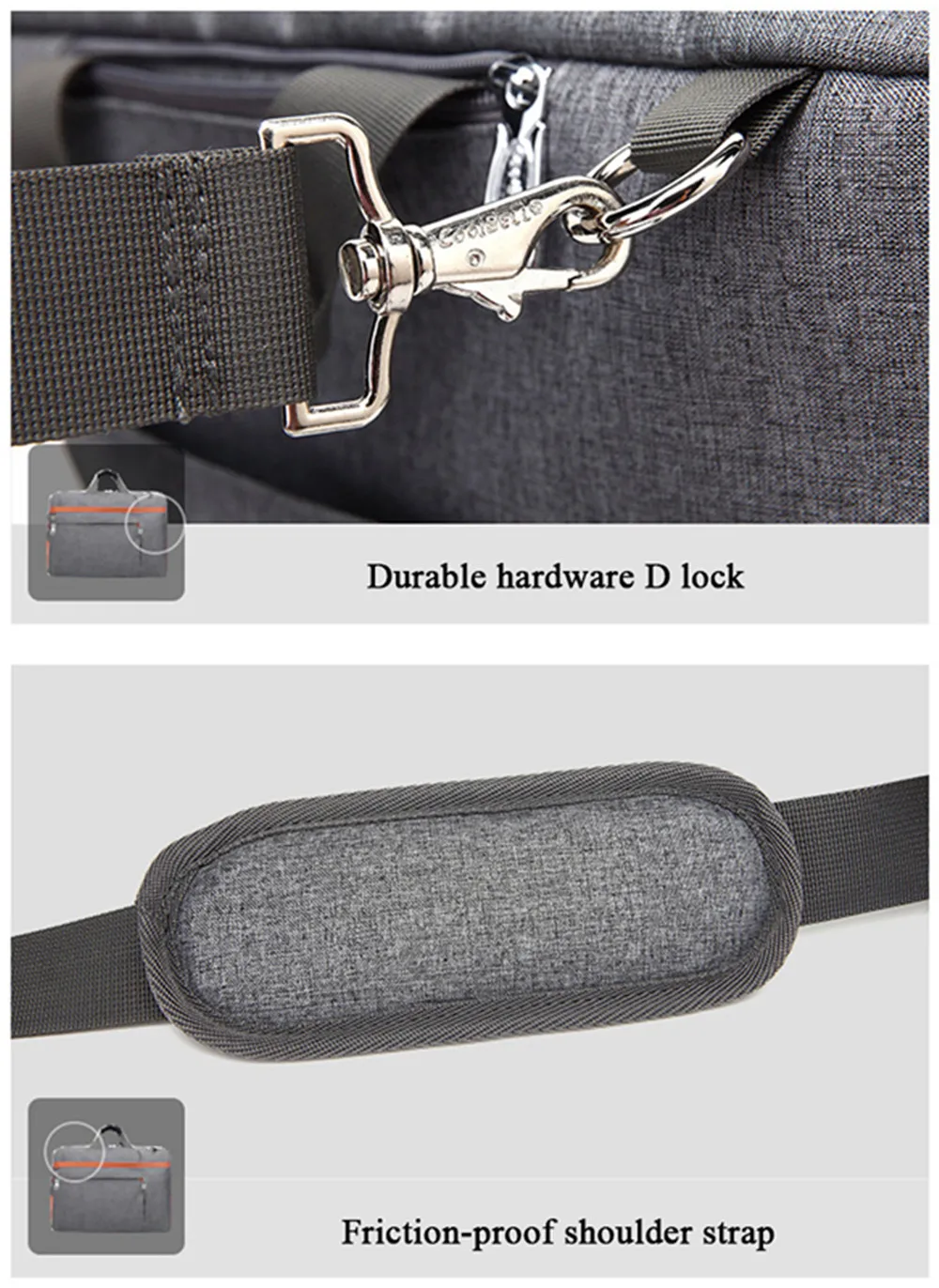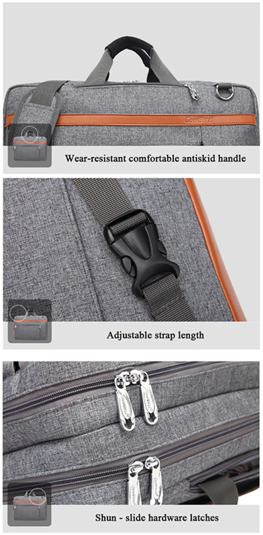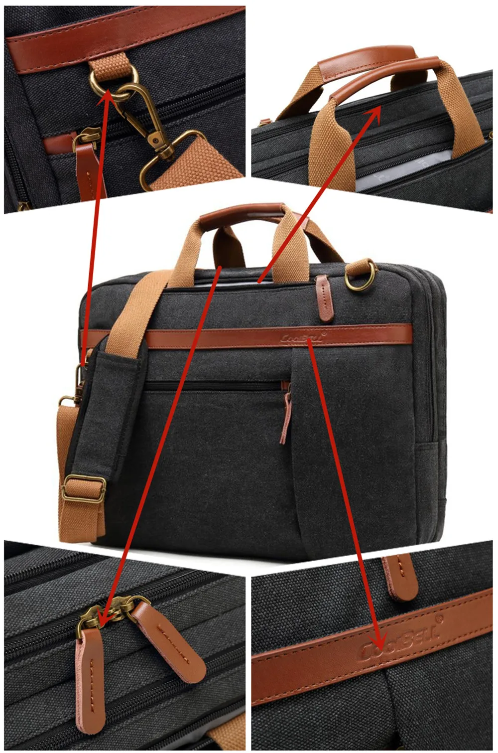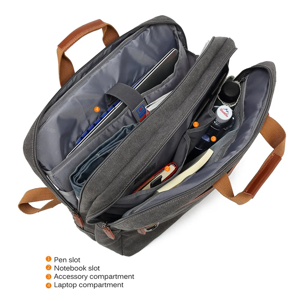 Convertible design. This bag can be easily converted to backpack, shoulder bag and briefcase.Removable shoulder strap is adjustable. The back strap can be hidden in a big back compartment when you use it as briefcase and shoulder bag.