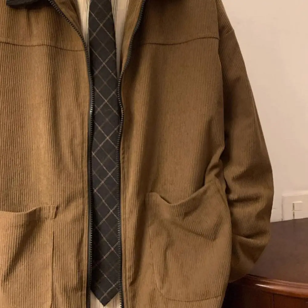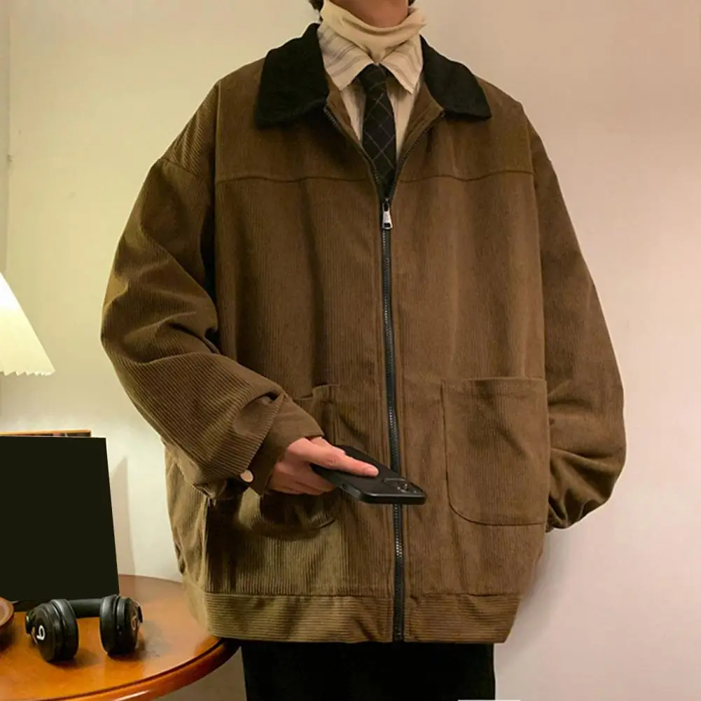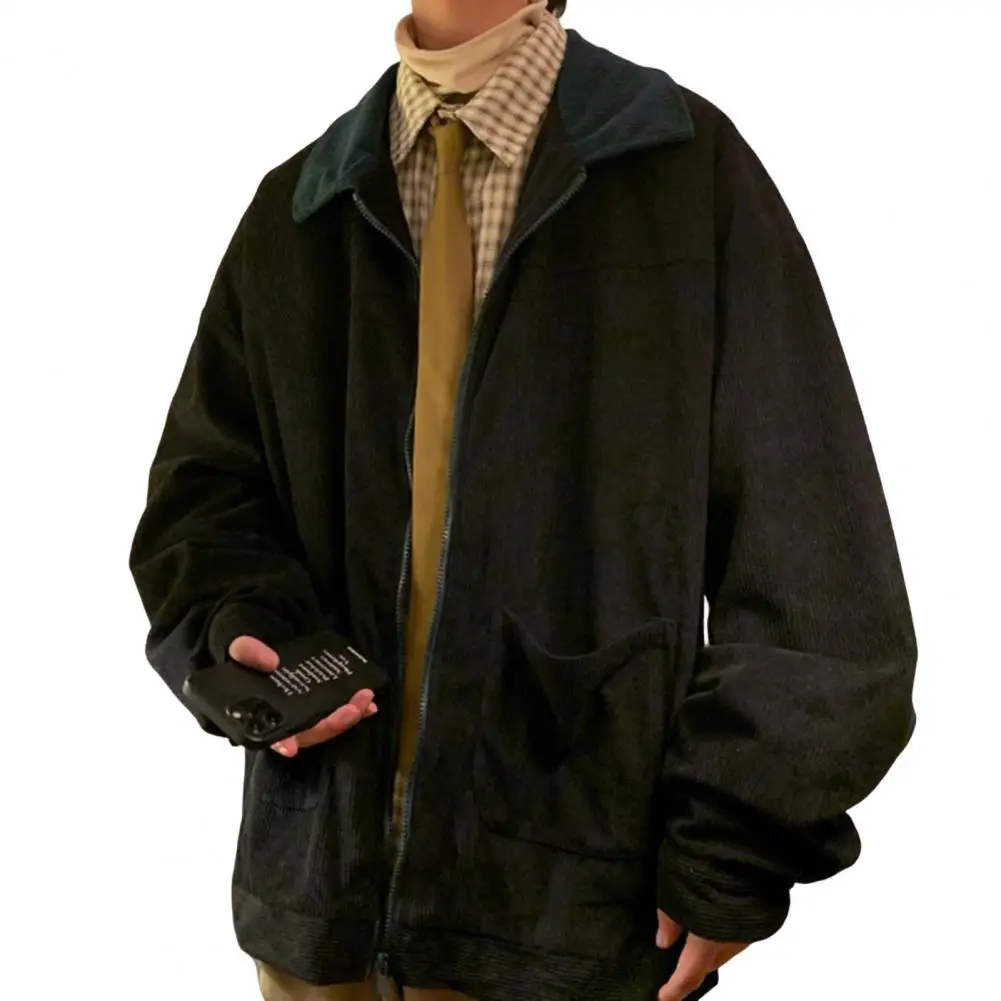 Men Jacket Patchwork Color Loose Fit Full Zipper Placket Casual Coat Lapel Long Sleeve Corduroy Outwear