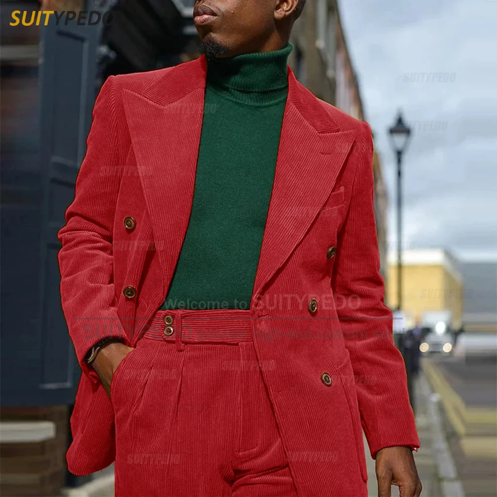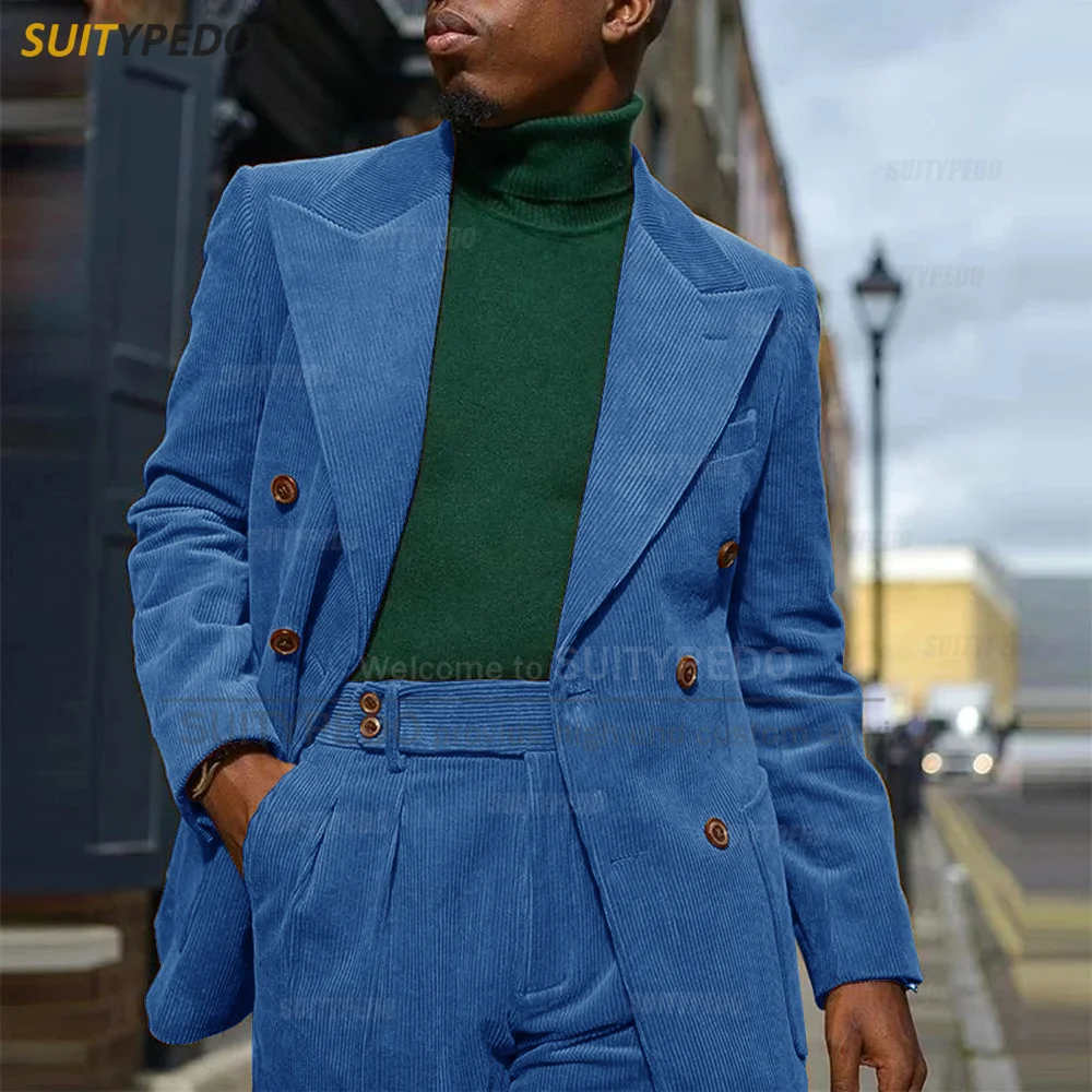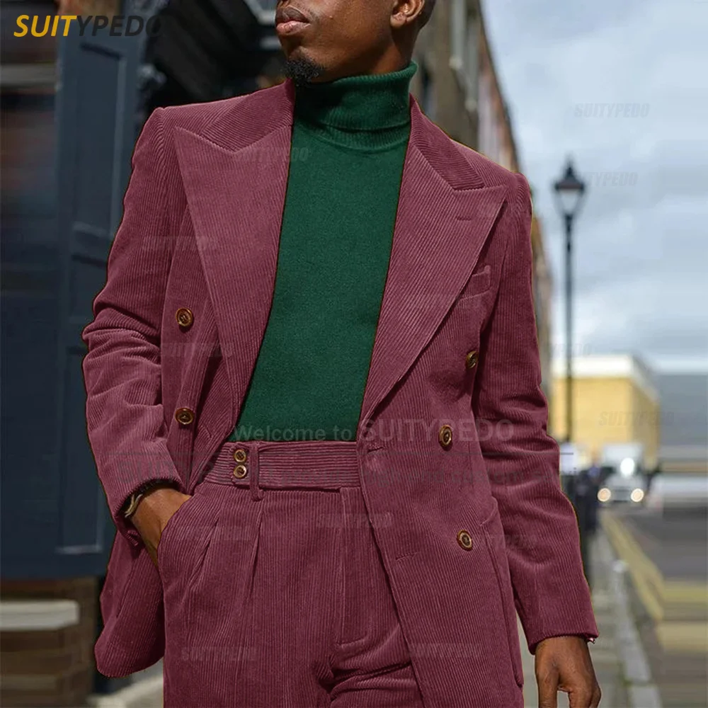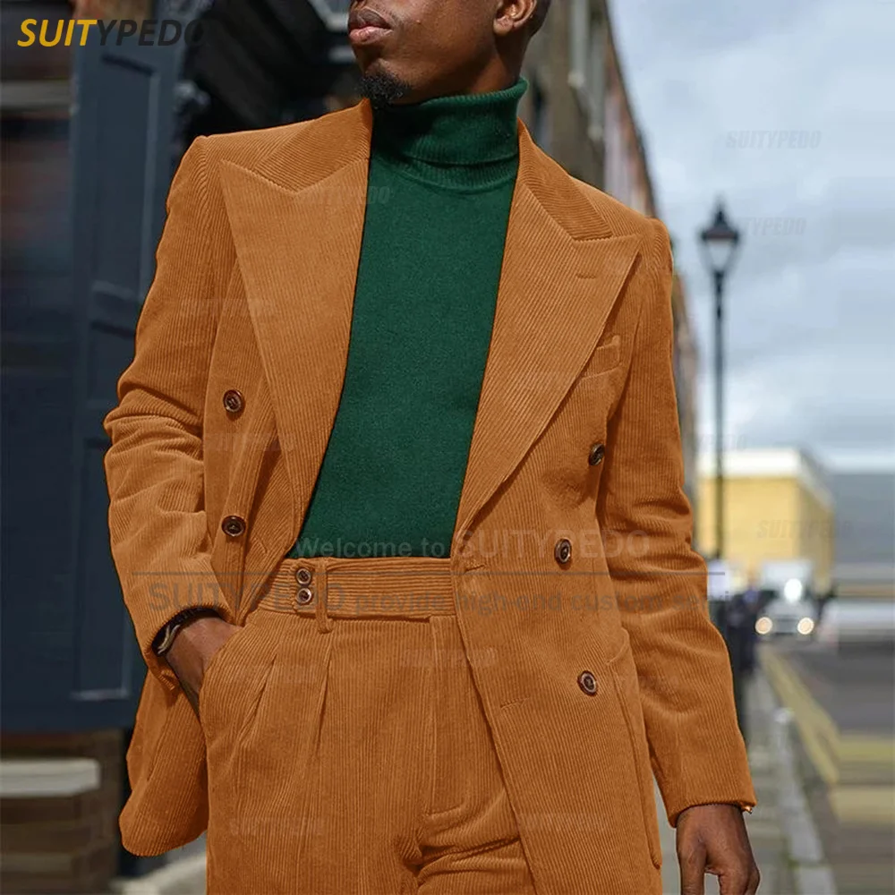 Corduroy Men Suits Slim Fit Set Double Breasted Blazer Pants 2 Pieces Tailor-made Luxury Business Party Wedding Tuxedos for Men