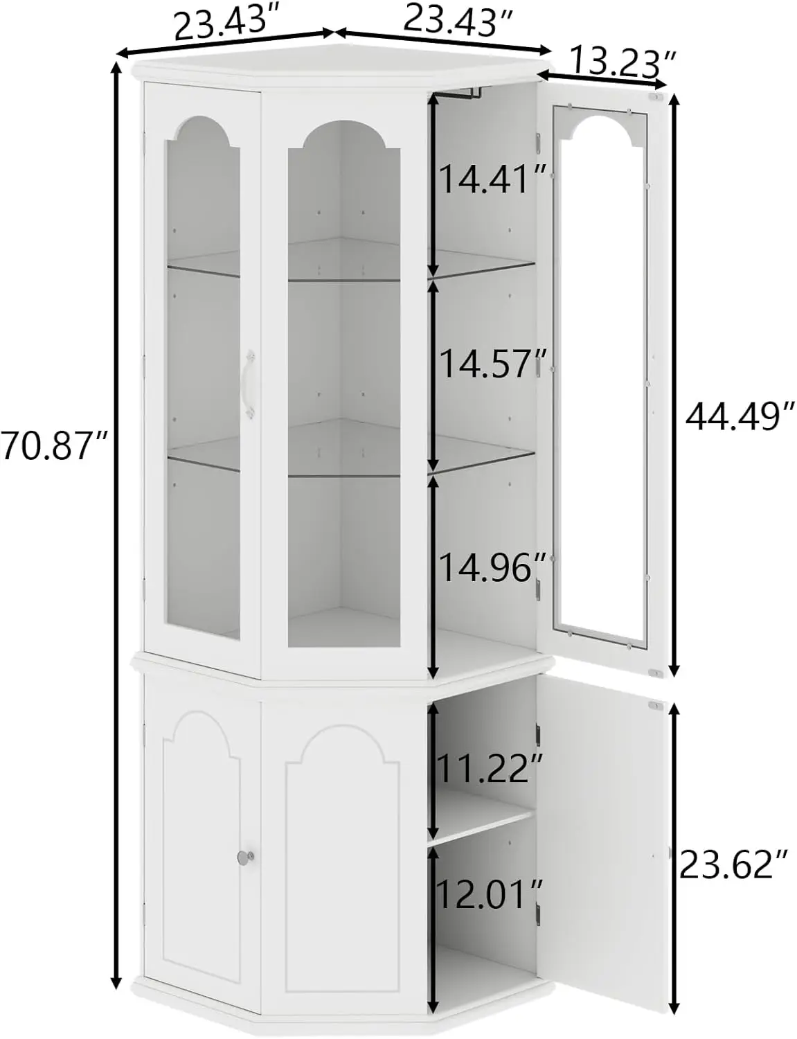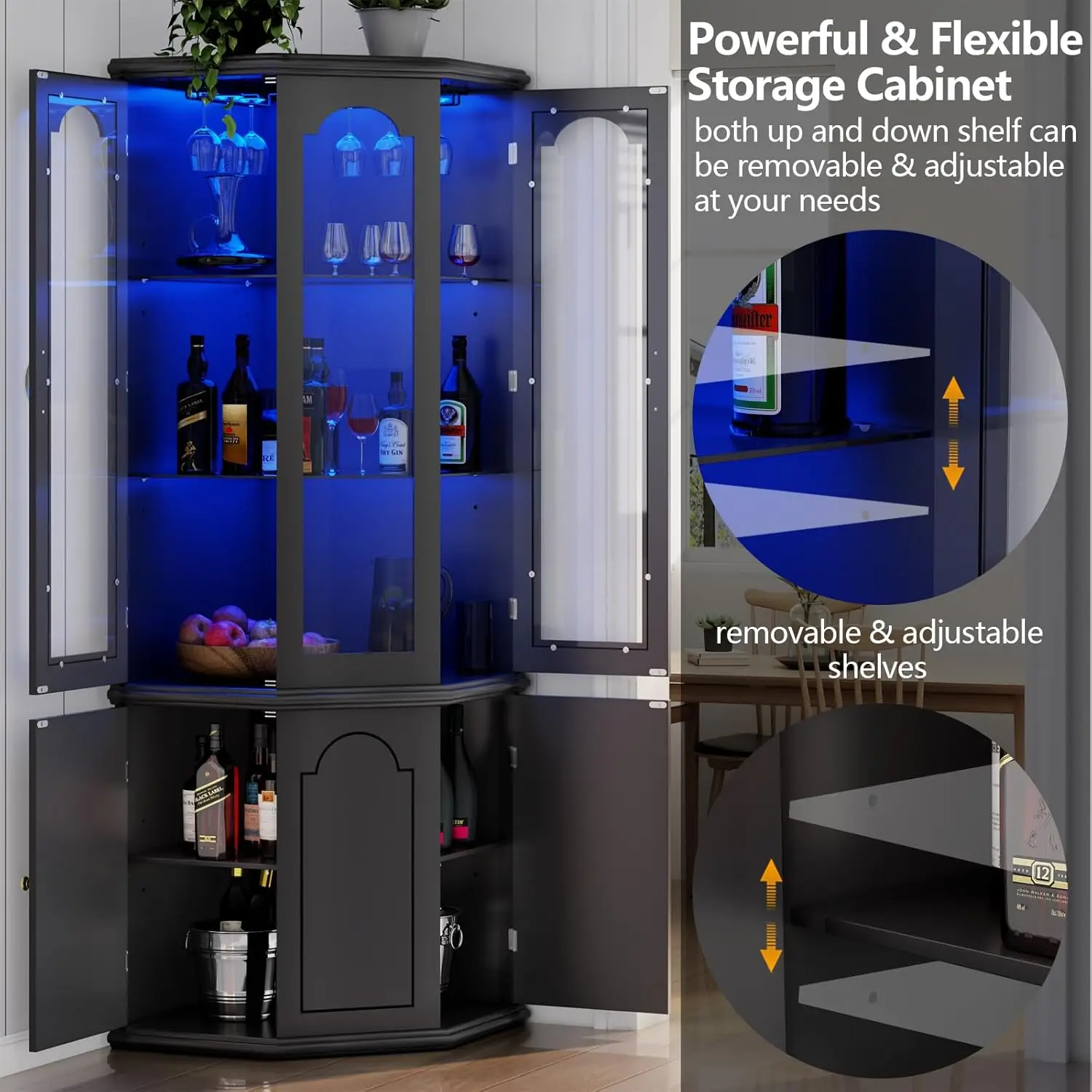 - [Exceptional Storage Space] Compared to traditional corner cabinets, the Gyfimoie 70.87”H x 23.6”D corner bar cabinet offers more storage space with its polygonal design. The upper 3-tier cabinet features a sleek tempered glass door, providing a practical and stylish option for storing and displaying your wine collection. The lower 2-tier section shields the bottles from dust and light, preserving their quality. All shelves are adjustable, allowing you to customize your storage to accommodate items of different sizes.