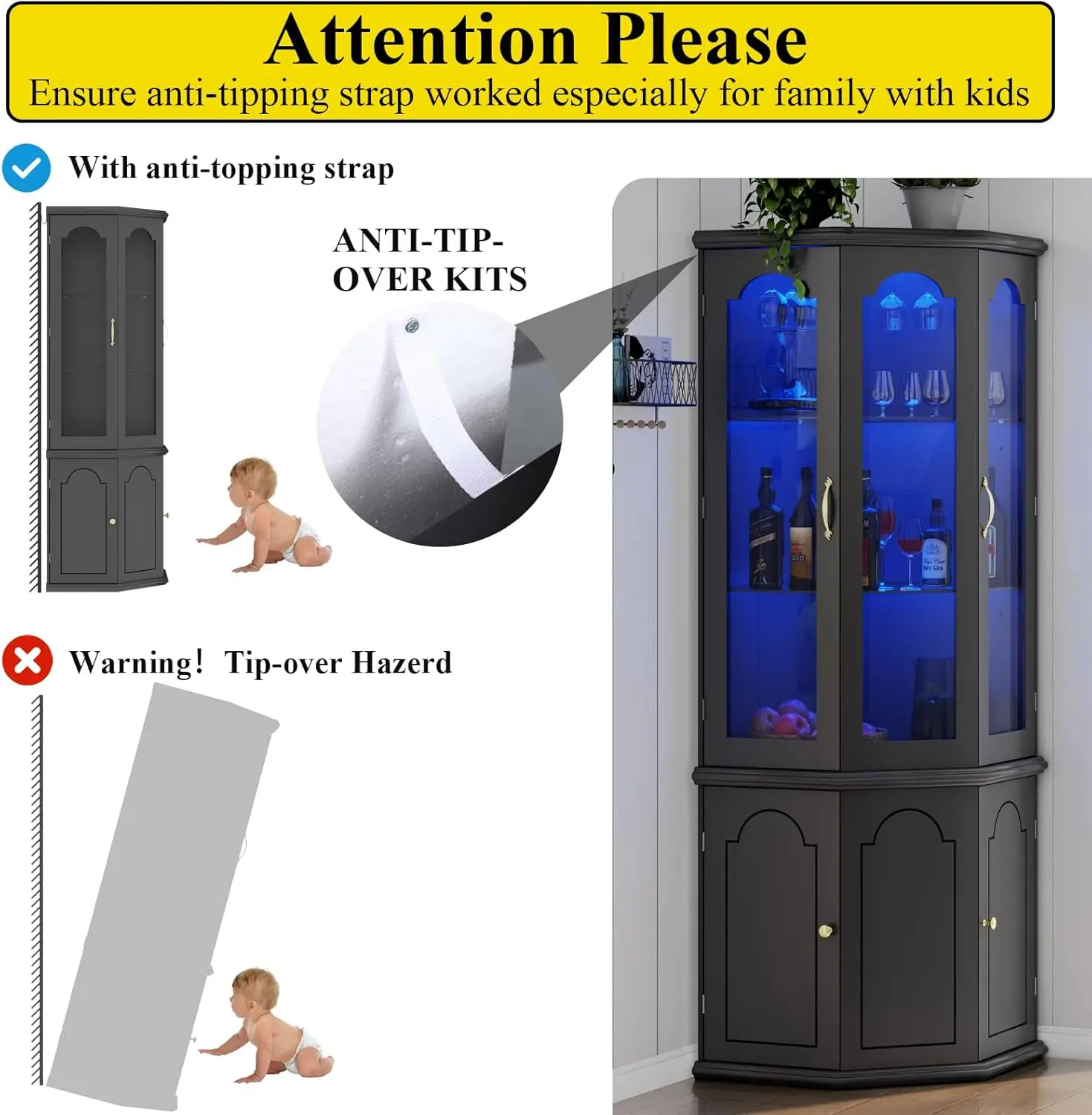 - [Wine Cabinet with LED Light] The inclusion of LED lights adds a touch of style and sophistication to this wine storage cabinet. Features LED lights that can be set to various colors and intensities, allowing you to create a captivating ambiance in your space while allowing you to display it in a visually appealing manner, making the wine collection a focal point in the room. Whether you’re hosting a gathering or simply enjoying a quiet evening, the LED lights in the corner wine cabinet enhance the overall atmosphere and elevate your wine experience.