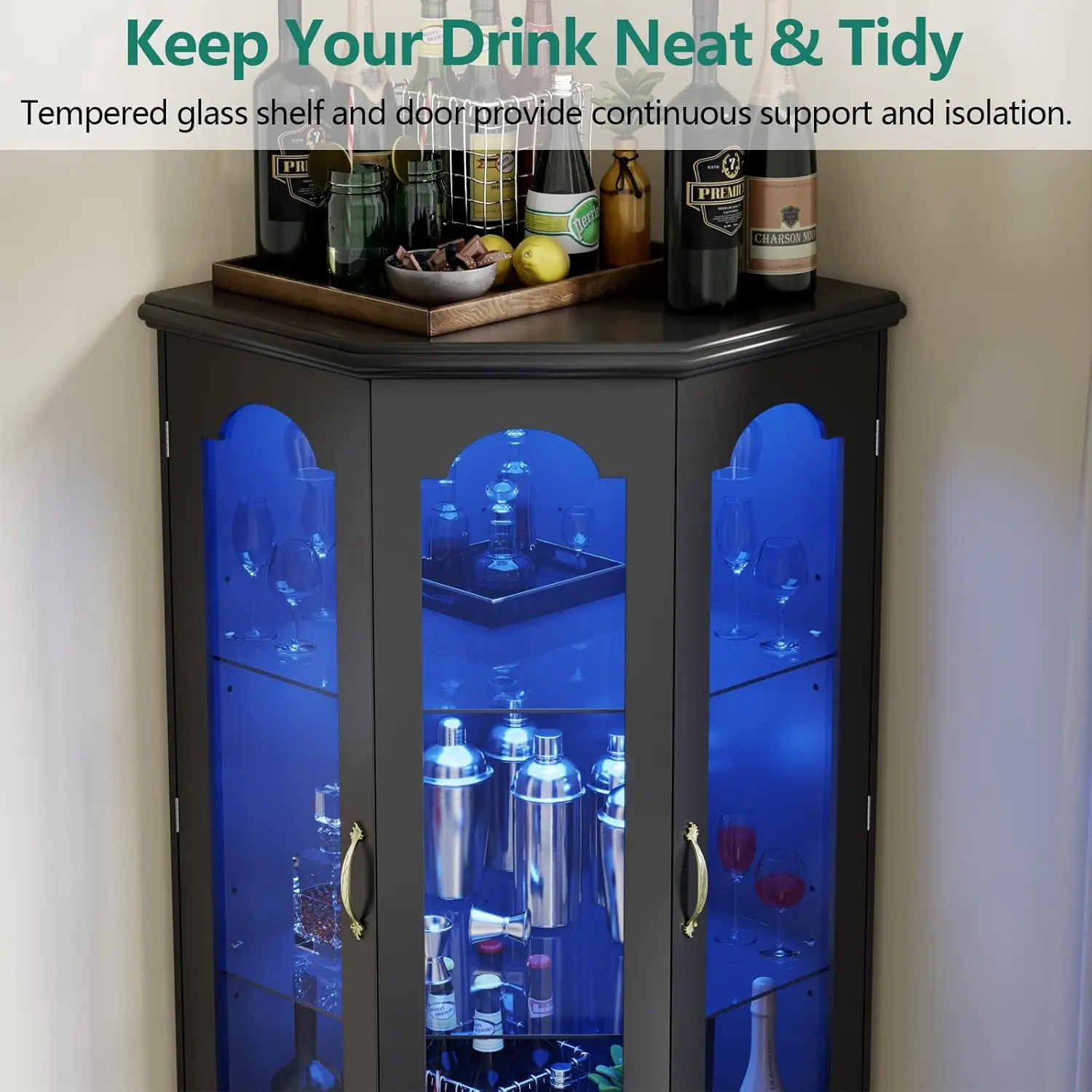 - [Modern Home Bar Cabinet] The corner wine cabinet is an ideal addition to any home bar, offering both practicality and style that enhances the overall bar experience. The wine cabinet combines tempered glass with LED lighting to enhance its visual appeal. Its modern design incorporates clean lines, smooth finishes, and minimalist details. The result is a timeless and eclectic wine cabinet that complements any space without being overpowering.