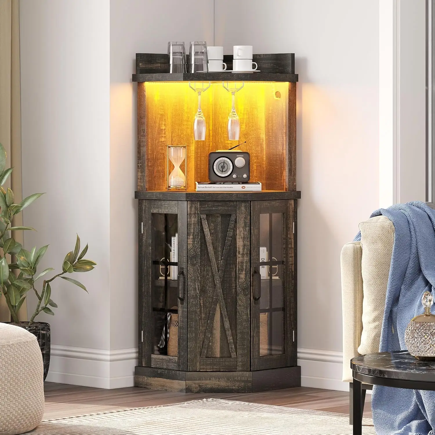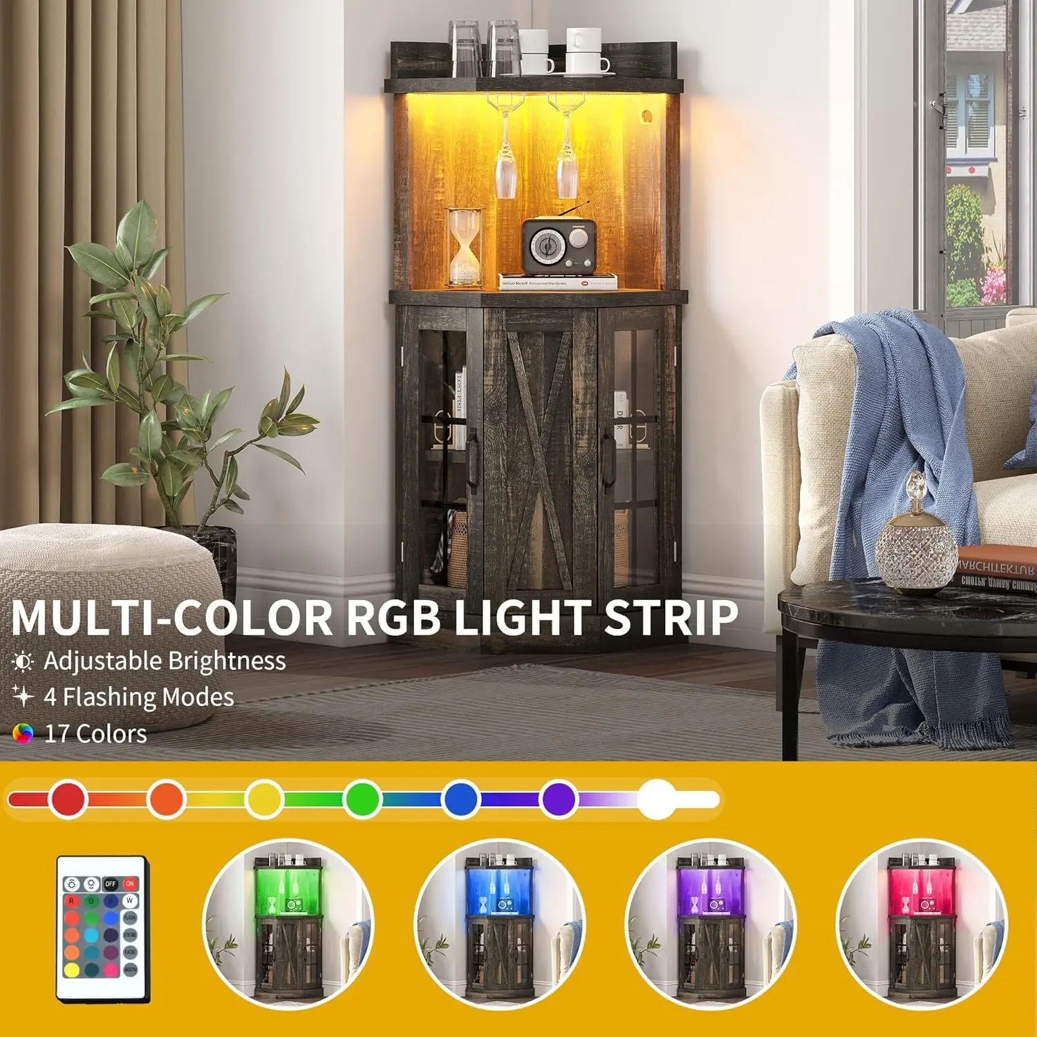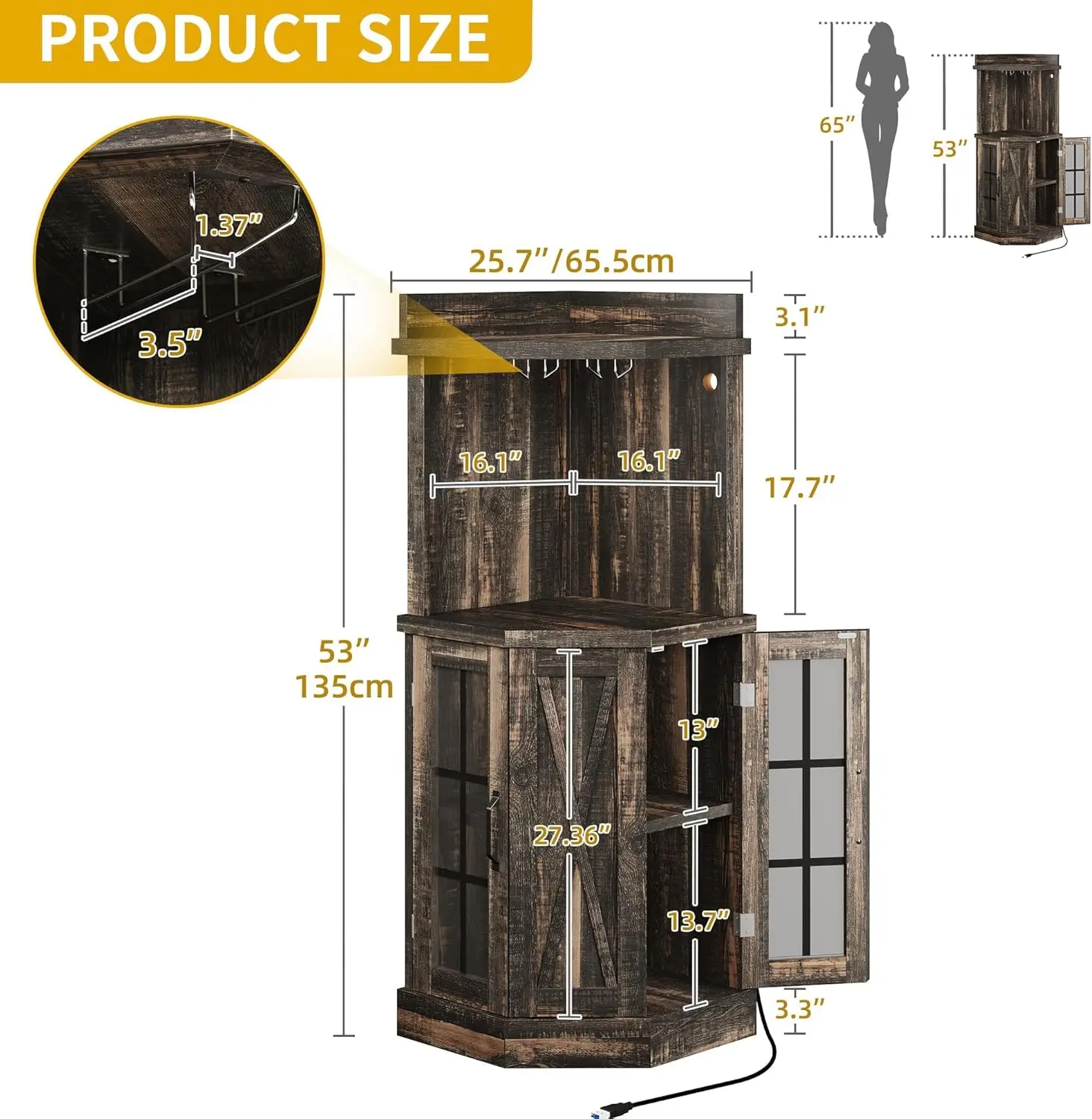 Corner Bar Cabinet with Glass Door & LED Lights 53″ Farmhouse Wine Storage Cabinet with Glass Holder 4-Tiers Liquor Cabinet Bar