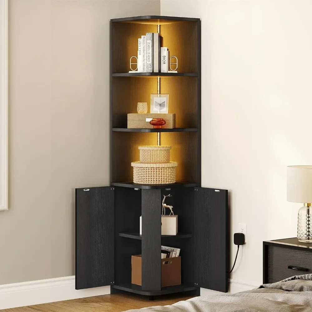 Corner Cabinet with LED Lights, 71.1“ Corner Bookshelf and Bookcase with Storage, Modern Display Corner Shelf for Living Room,