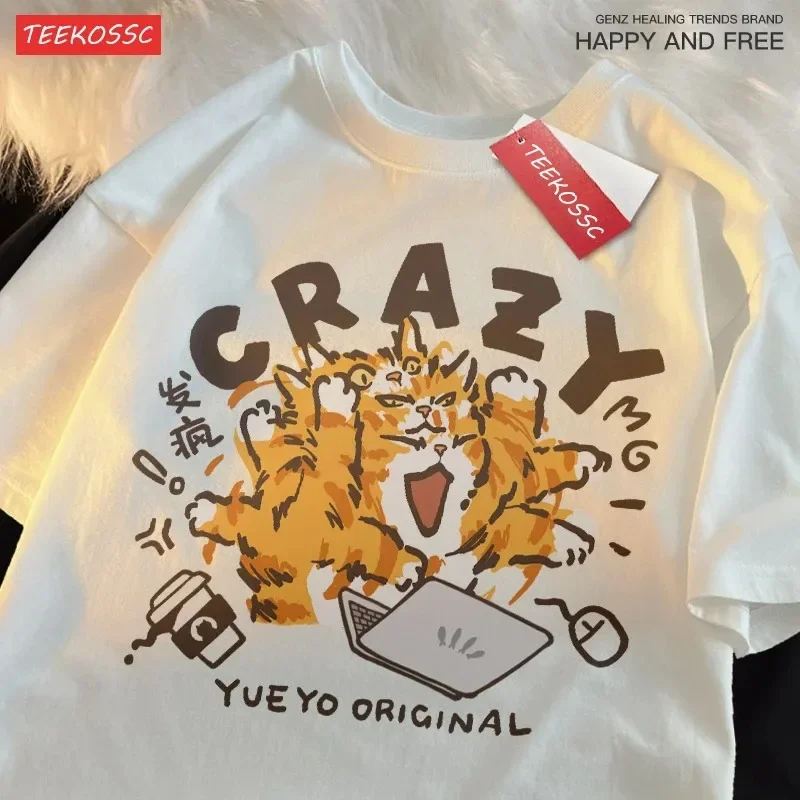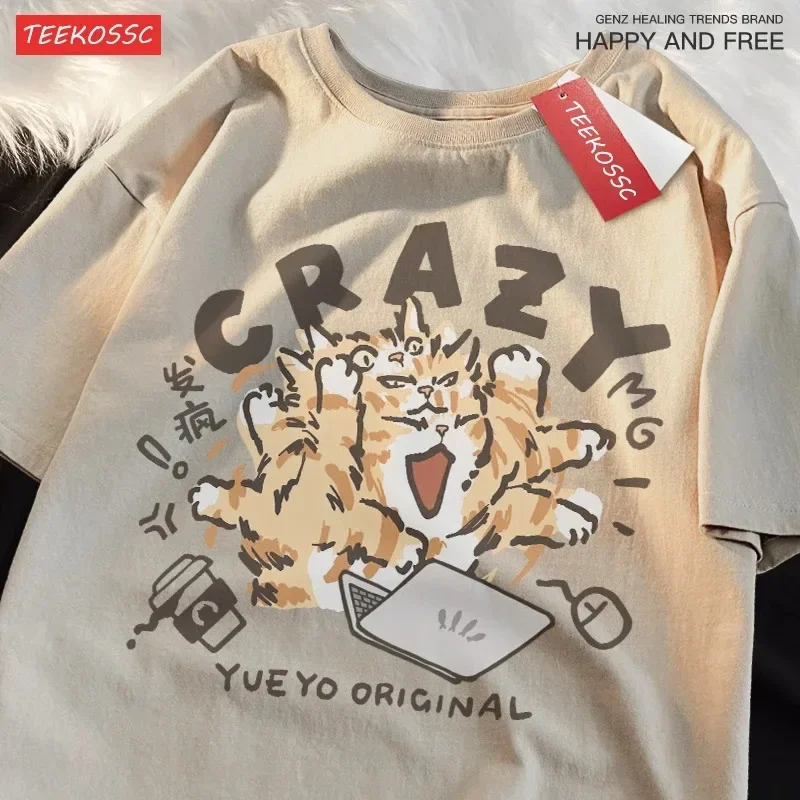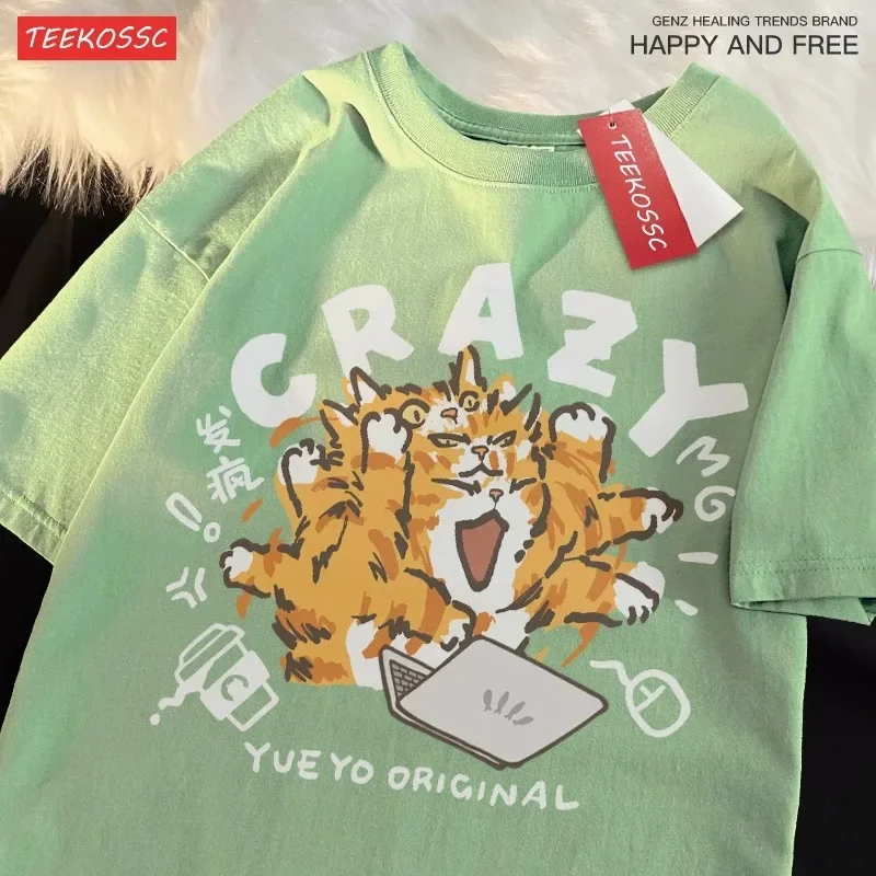 Crazy Orange Cat Light Green Fun Cat Work Shoulder Drop Short Sleeve Plus Size T-Shirt Women’s Cotton Loose Version T-Shirt