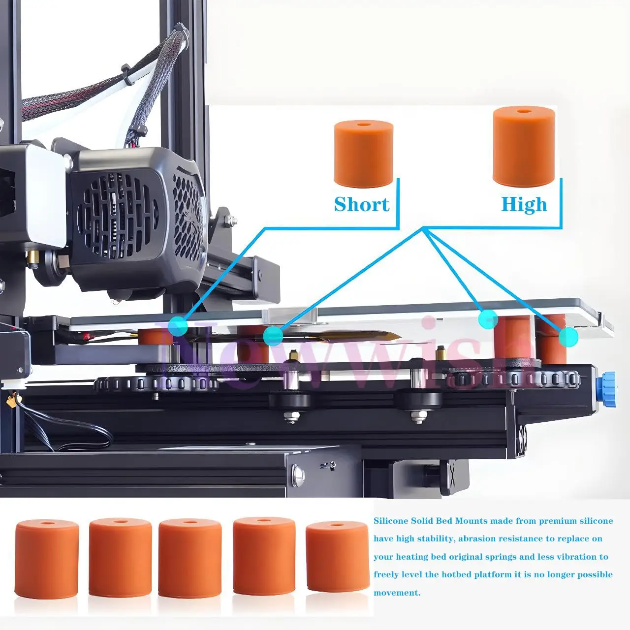 - Silicone Solid Bed Mounts made from premium silicone, it is stable, durable and heat-resistant.Can help cutting back vibrations .These silicone buffers serve to replace on your heating bed original springs and it is no longer possible movement, your set levels remain.