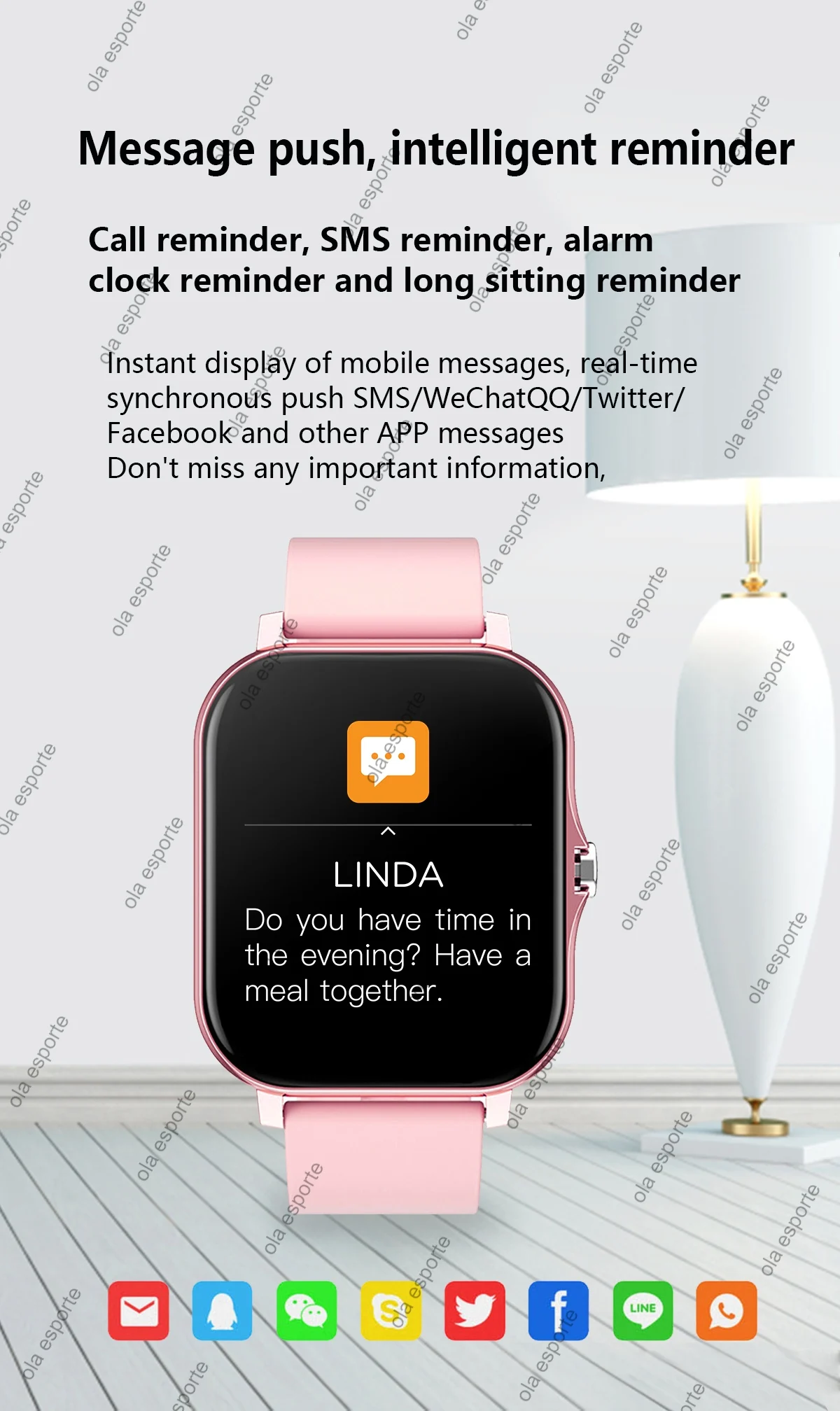 10.Other functions: pedometer,sedentary reminder, Calendar,motion tracker,alarm clock,weather push, stopwatch, timer, stopwatch,calculator, World clock, camera remote control, find your phone.