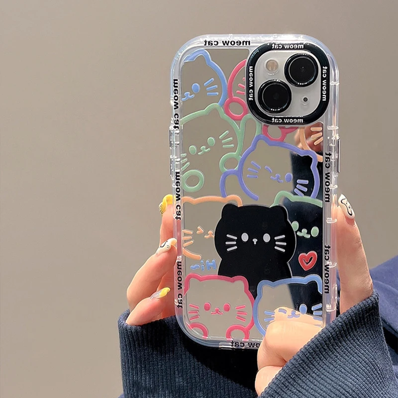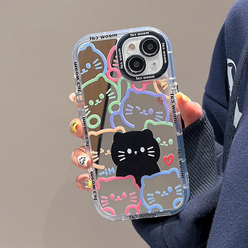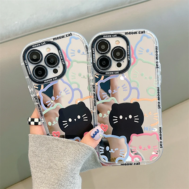 Cute Hello Cat Plating Mirror Painte Lines Phone Case For iPhone 16 15 Pro 14 13 12 11 Pro Max Soft Silicone Hard Cover Capa Y2k
