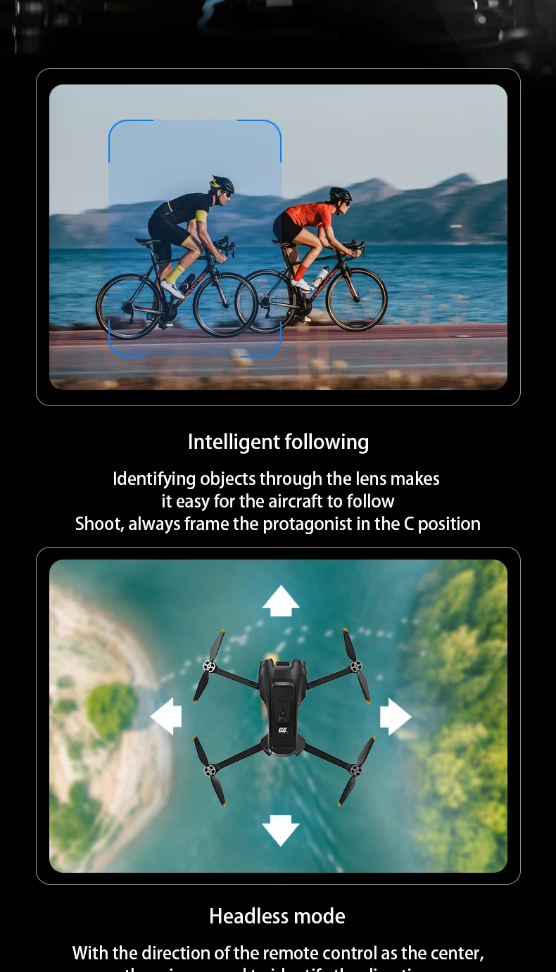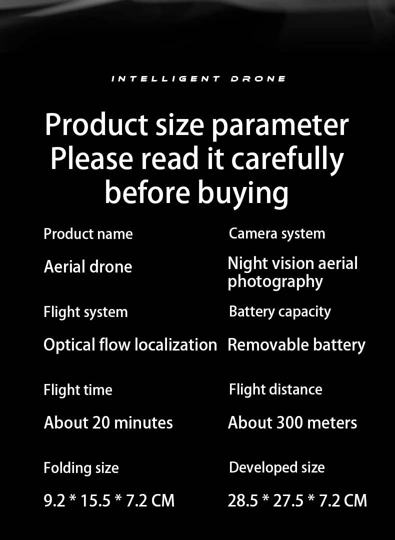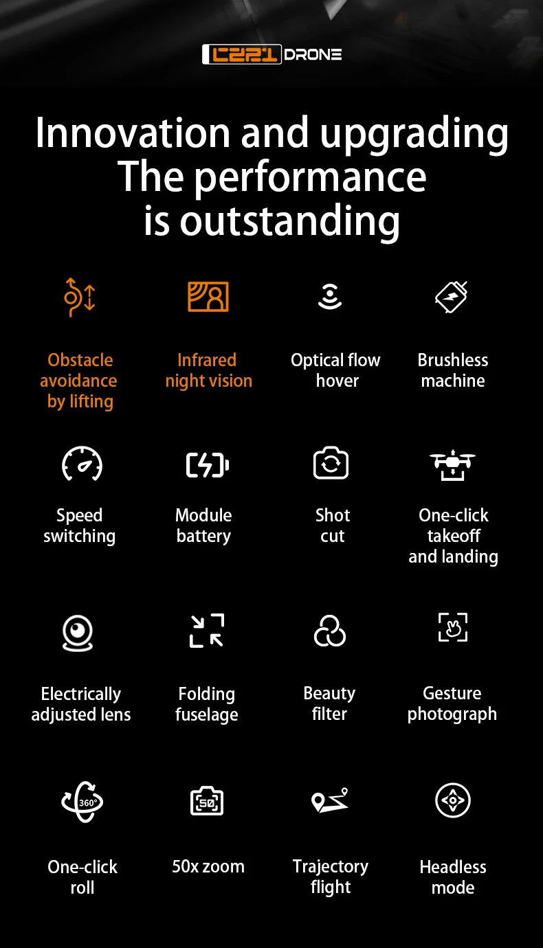 Brushless motor, long-life high-voltage battery, four-sided obstacle avoidance, lifting and obstacle avoidance function, infrared night vision function, light freeze, the camera has an added gimbal shock-absorbing ball with anti-shake function.