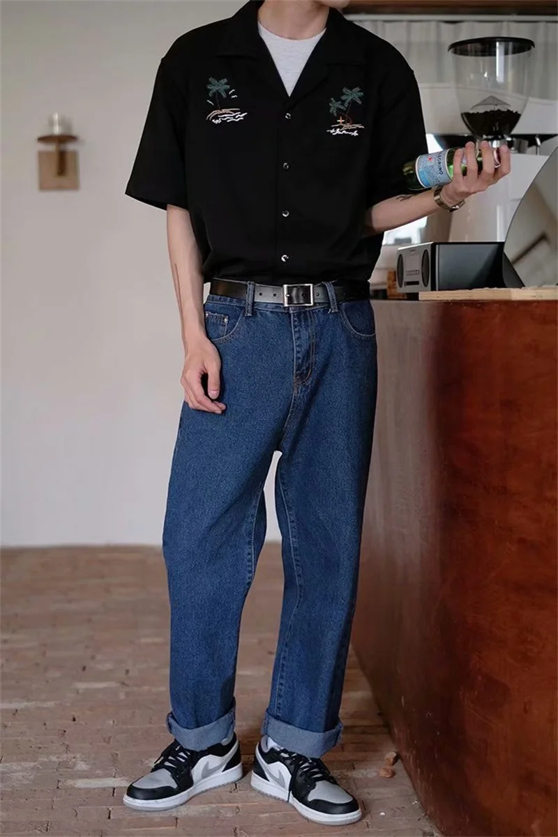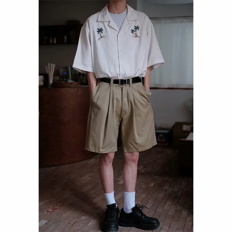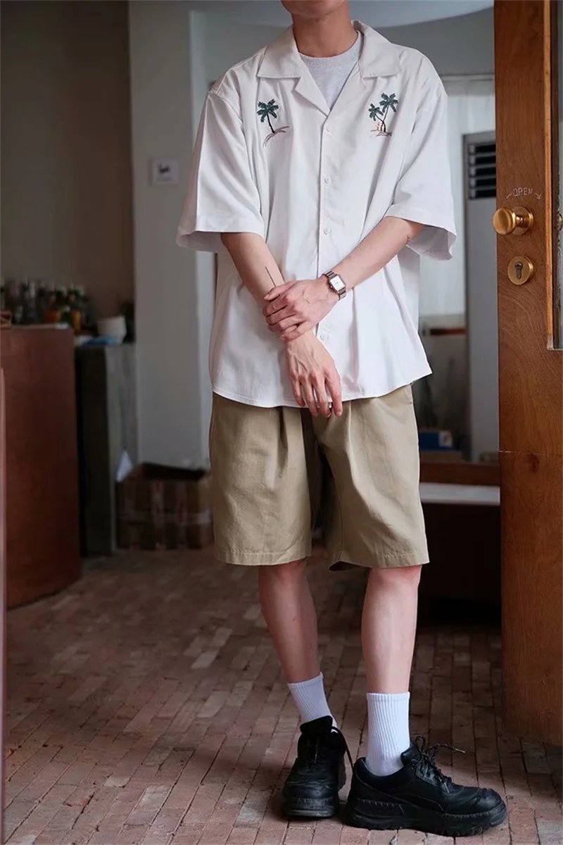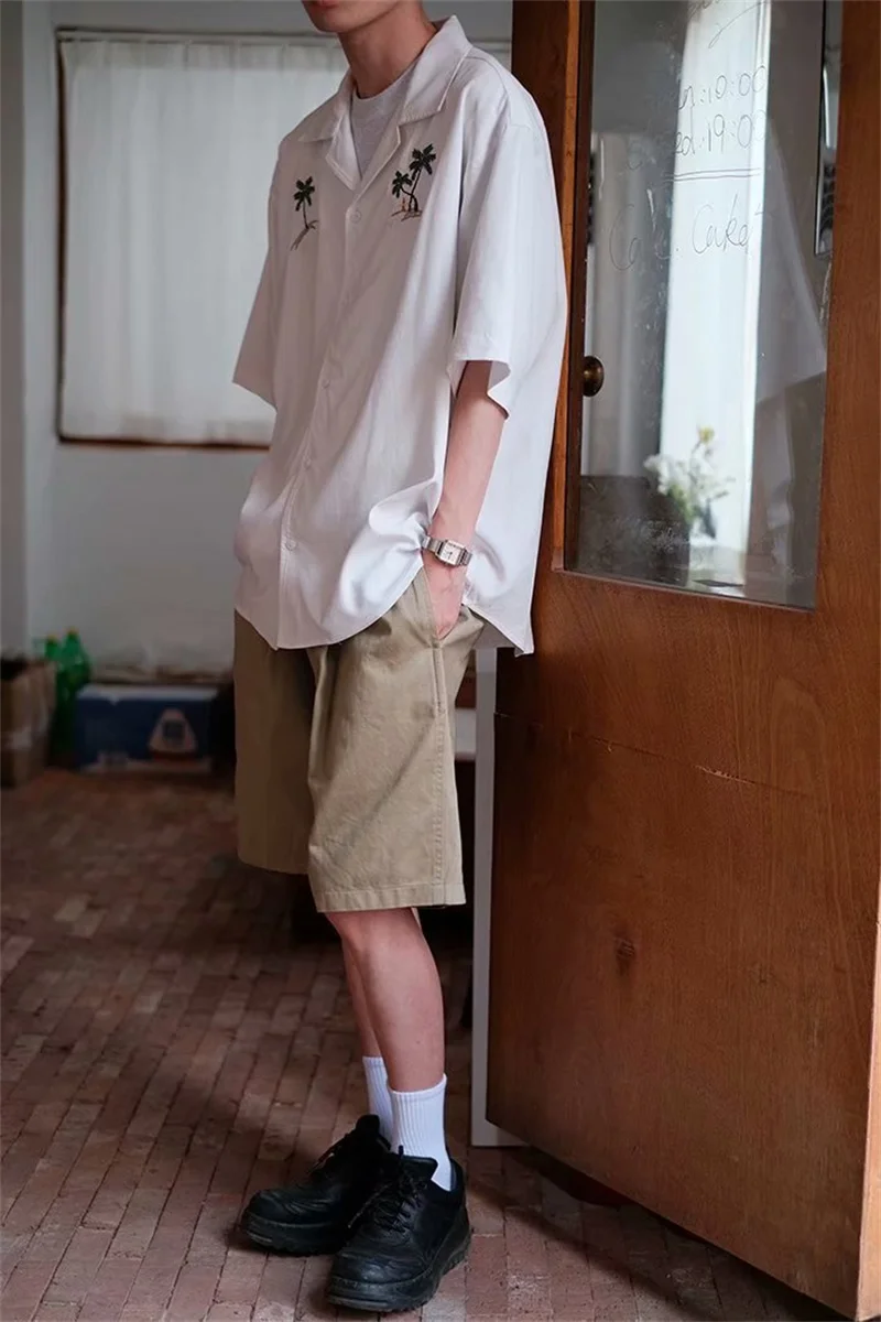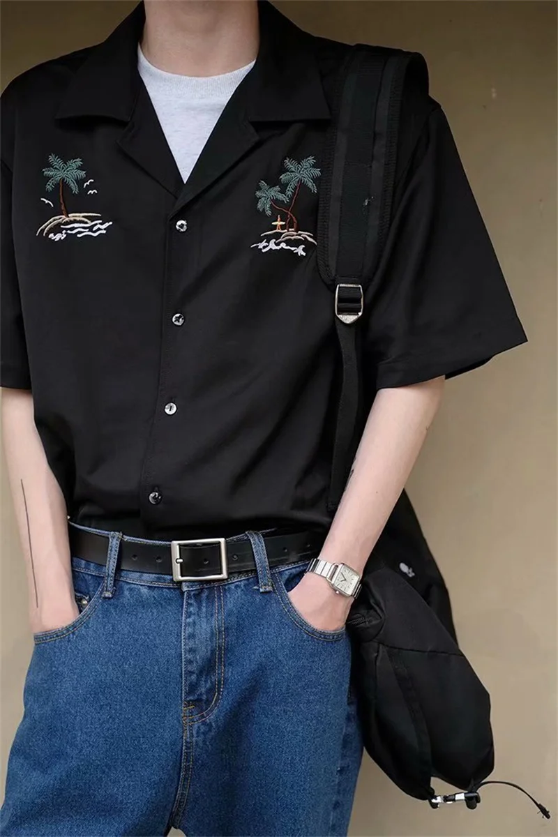 Dark Icon Coconut Tree Button Down Collar Vintage Men’s Shirt Short Sleeve 2024 Summer Cargo Shirts for Man Black White