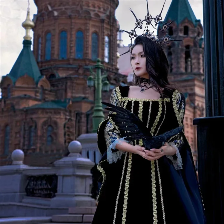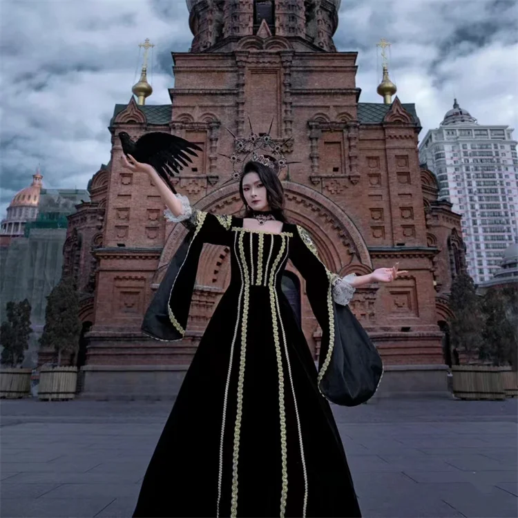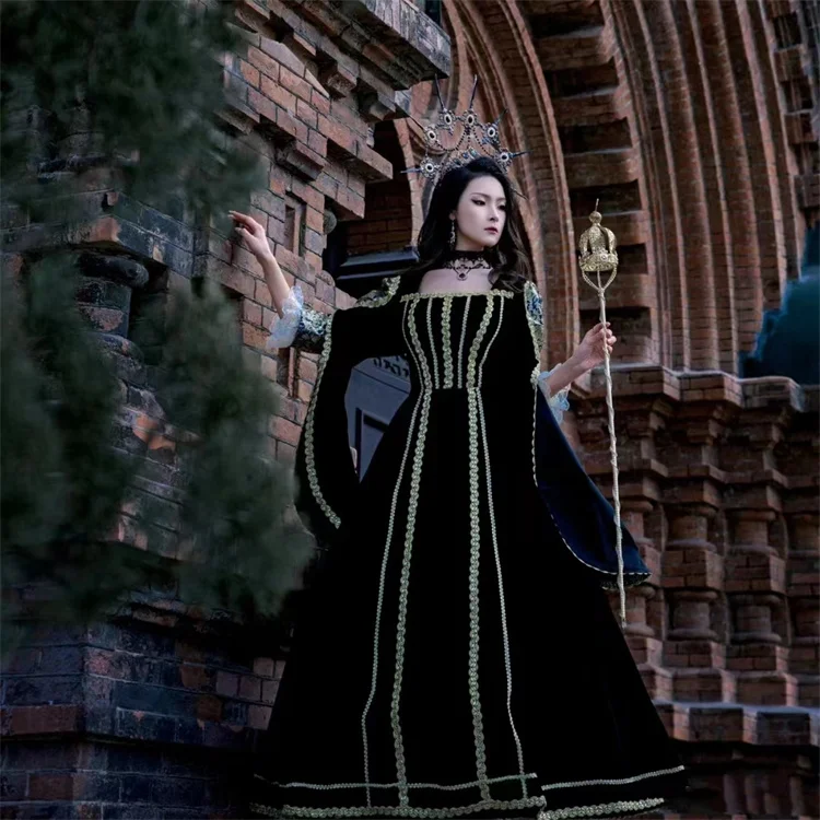 2024 New European Renaissance Wine Red Court Dress Spanish Pompon Princess Stage Dress Printed Annual Party Costume Renaissance