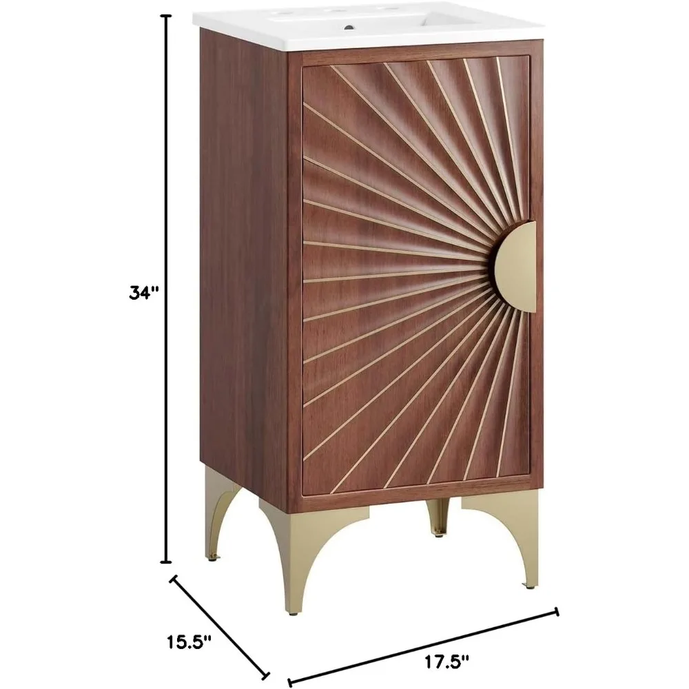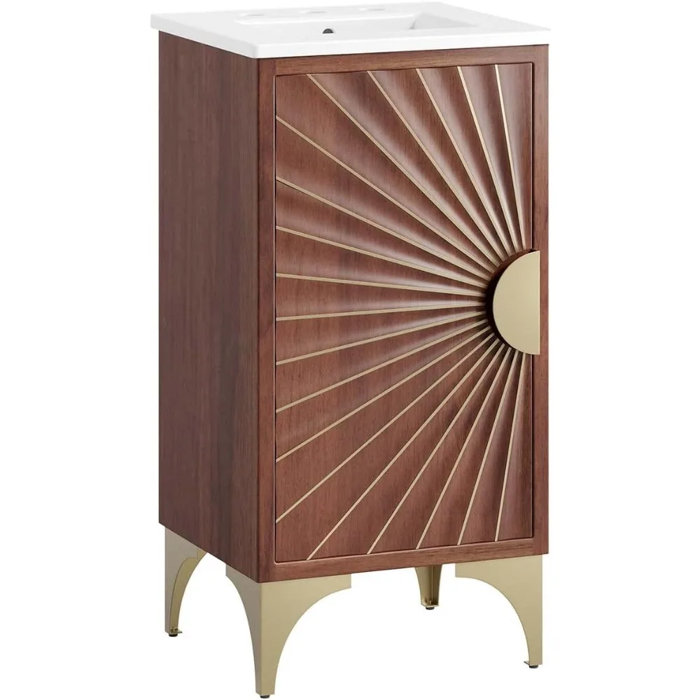 - SUNSHINE BATHROOM VANITY – Energize your bathroom space with the powder-coated brass details, rich wood grain, and sun ray design that radiates from this bathroom vanity cabinet