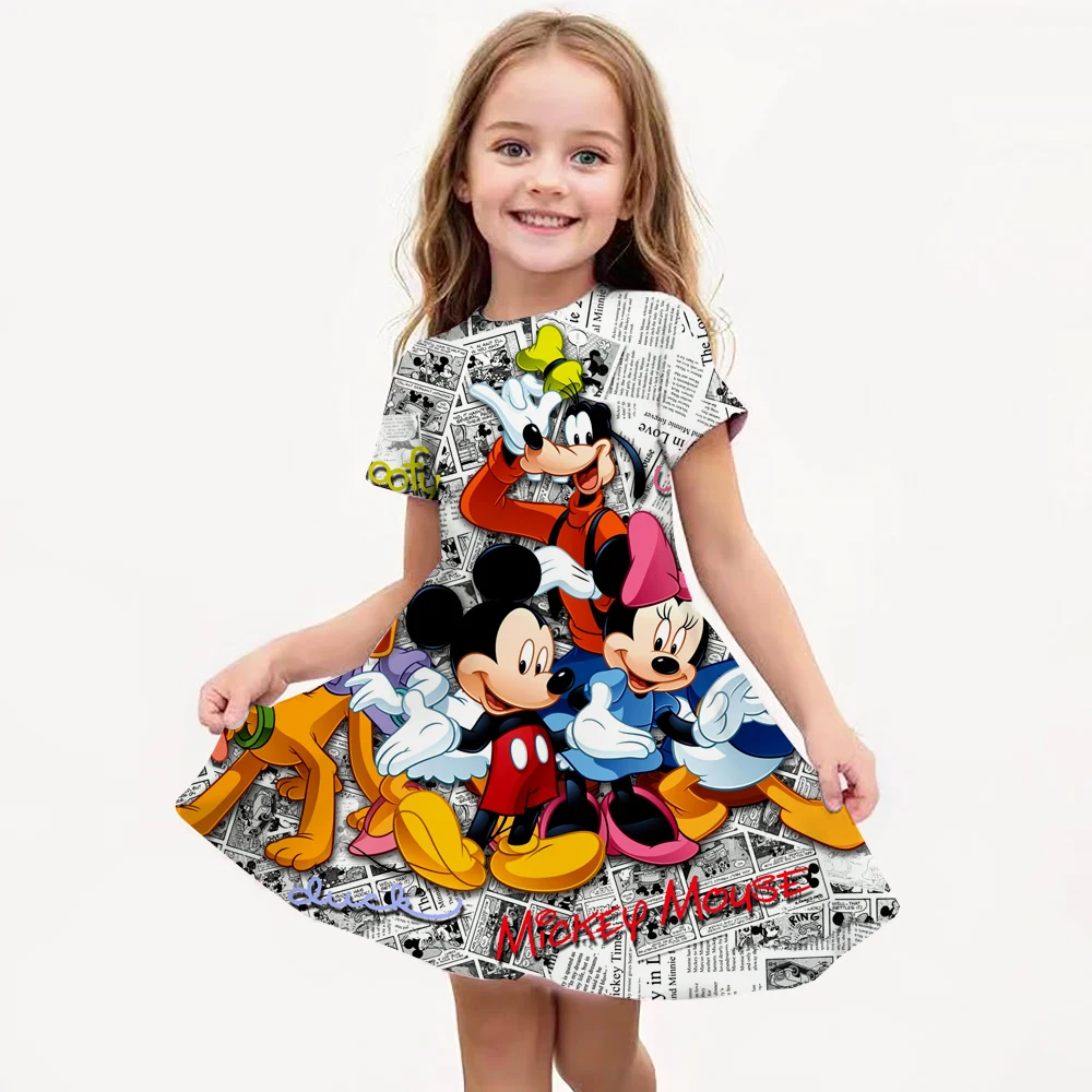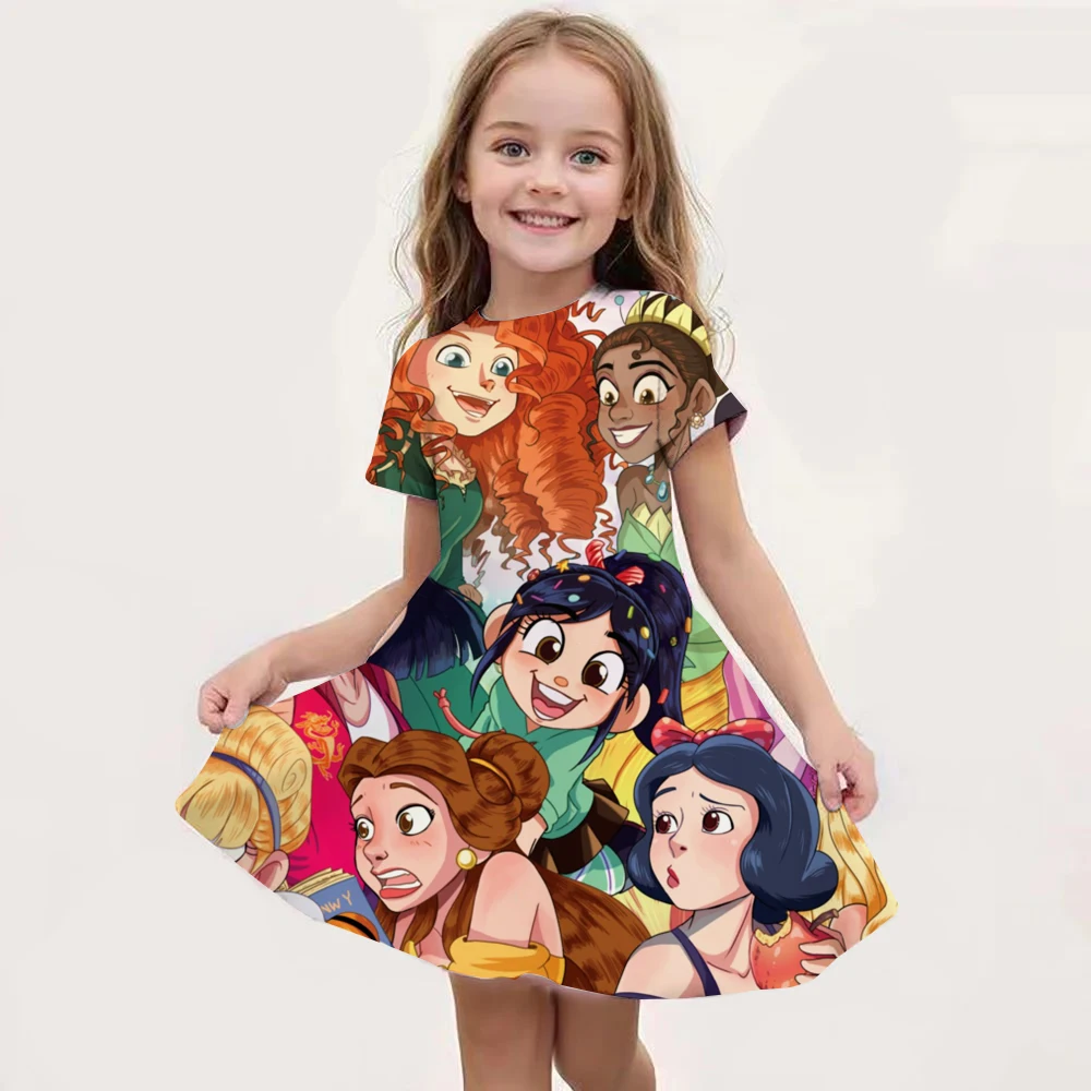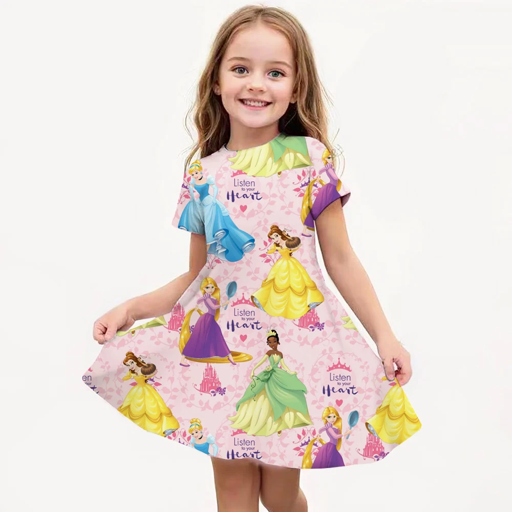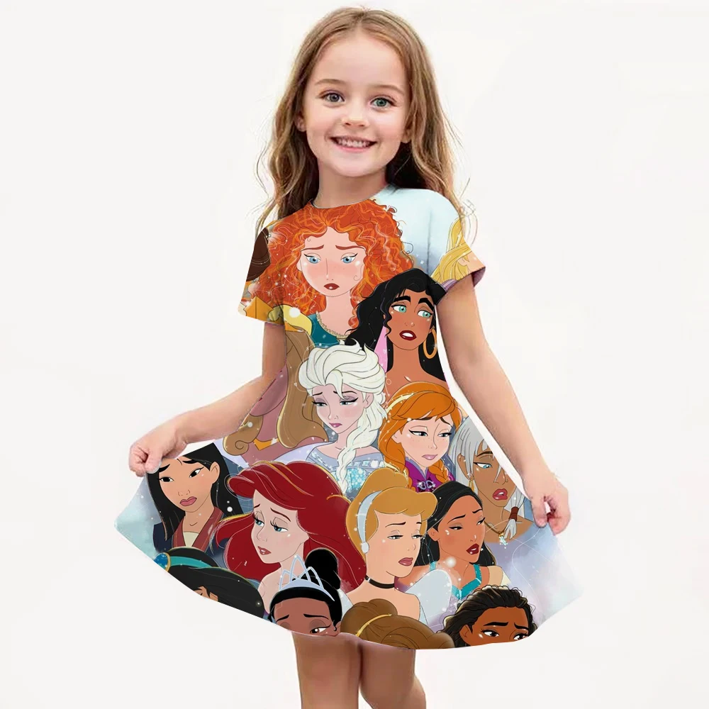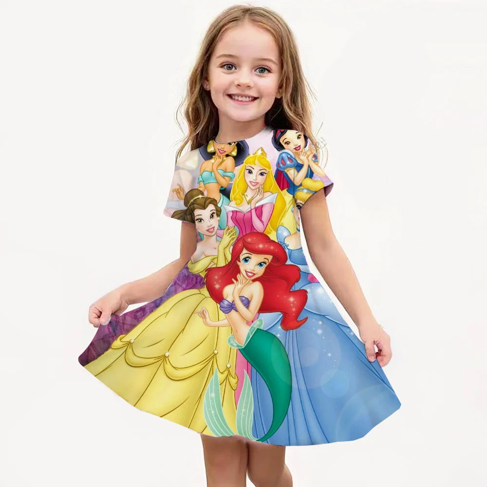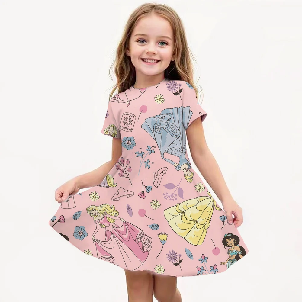 Disney Princess Printed Dress Girls Summer Fashion One-piece Dress Kids Daily Casual Short Sleeve Clothing Cute Cartoon Outfit