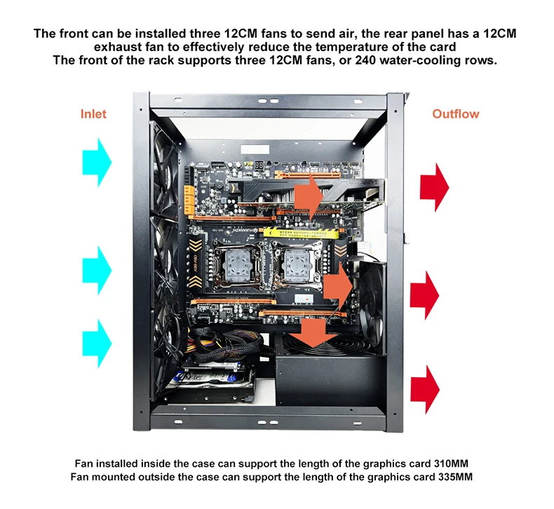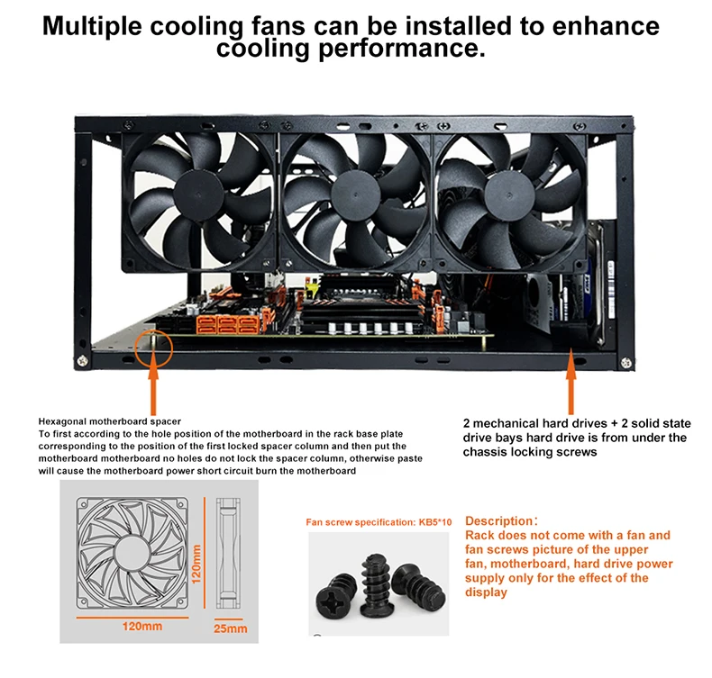 Portable Stand: Metal Air Water Cooling Fan Stand has enough space for a 305*330/330*330MM motherboard. This is convenient and practical. It also supports 2 expansion HDD bays / 4 SSD bays.