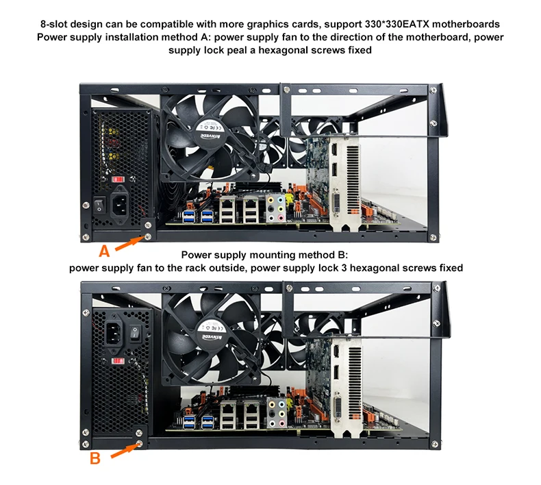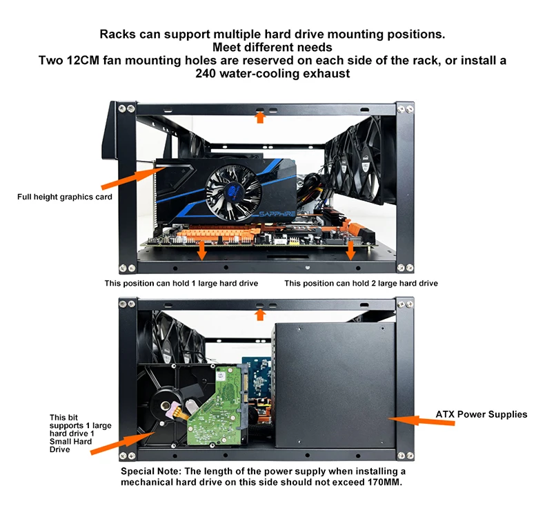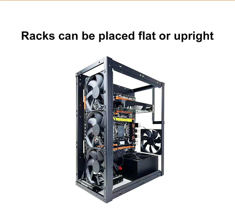 Extensive Compatibility: Stackable Open Chassis Rack has wide compatibility. It supports E-ATX, ATX, MICROO ATX, ITX motherboards, and discrete graphics cards.