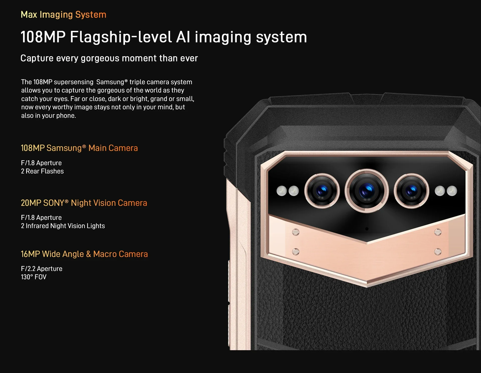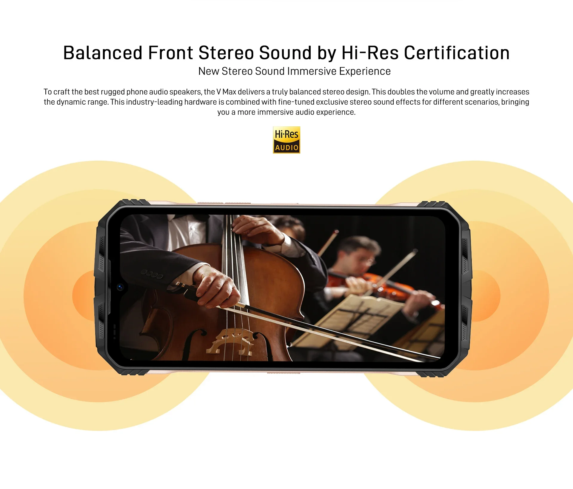 The Doogee V Max equipped with Arm Mali-G68 graphics engine and octa-core CPU featuring Arm Cortex-A78 speeds up to 2.6GHz provides exceptional performance in all aspects, like rapid screen and APP response, fast gaming, smooth video-calling,