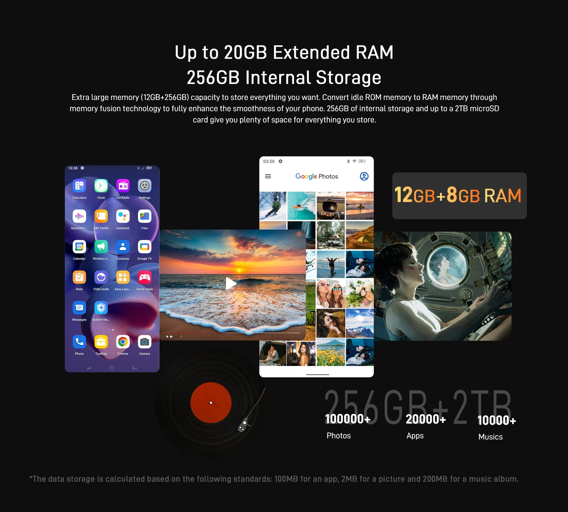 Extra large memory(12GB+256GB) capacity to store everything you want. Convert idle ROM memory to RAM memory through memory fusion technology to fully enhance the smoothness of your phone. 256GB of internal storage and up to a 2TB microSD card give you plenty of space for everything you store.