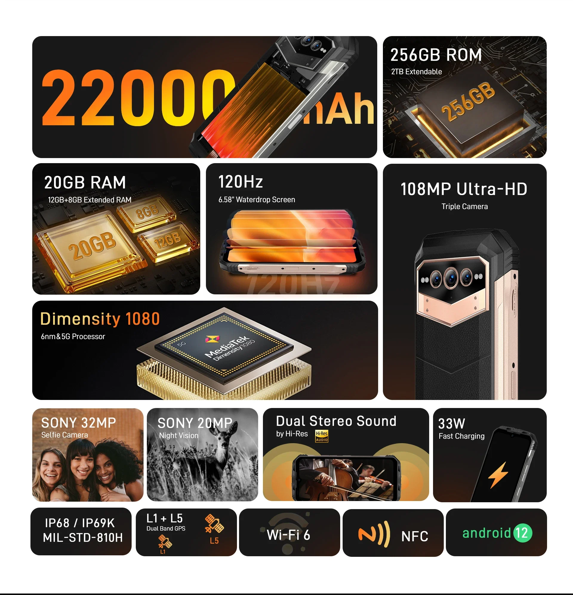 DOOGEE V Max 5G 22000mAh Smartphone 12GB 256GB 6nm Processor Octa Core Cellphones 108MP Camera Rugged 120Hz Display Mobile Phone