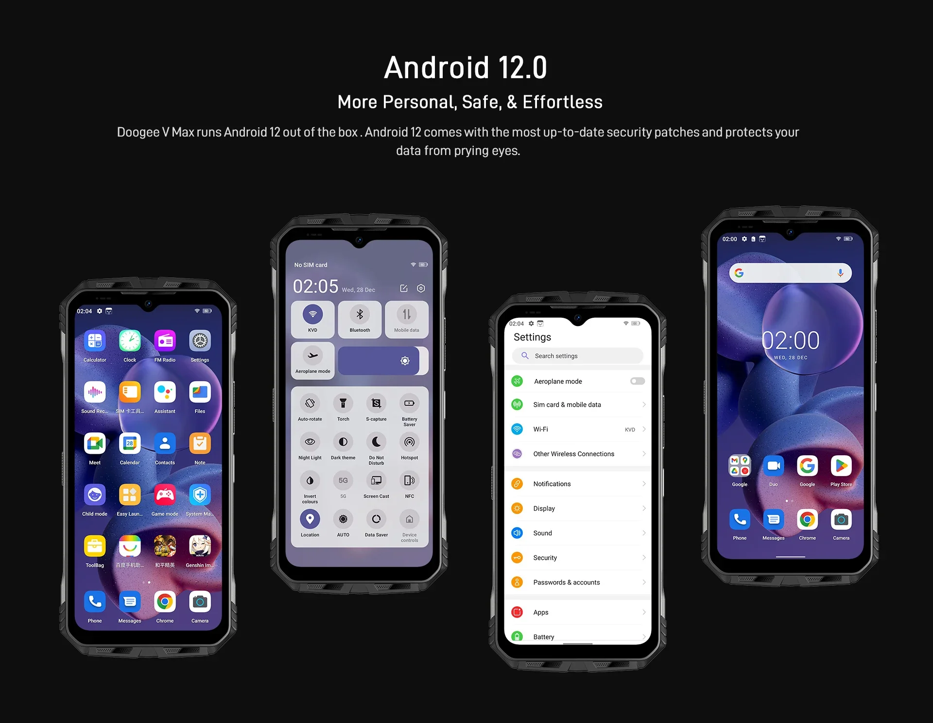 Doogee V Max runs Android 12 out of the box . Android 12 comes with the most up-to-date security patches and protects your data from prying eyes.