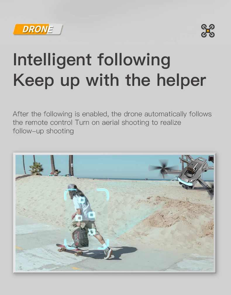 It can take off/land/calibrate with one button/ Emergency stop, beginners can flyBy using a mobile APP to watch the footage taken by the drone in real time,Enjoy the view in your handsAfter the following is enabled, the drone automatically follows the remote control Turn on aerial shooting to realize follow-up shooting