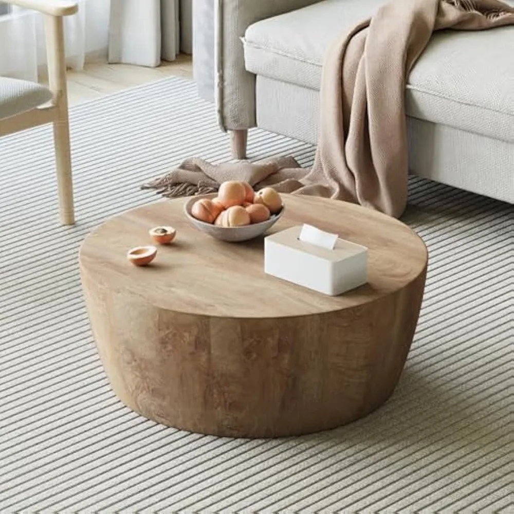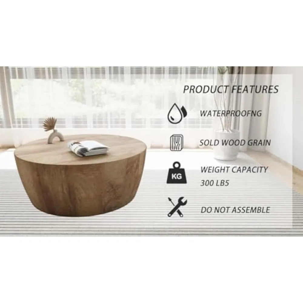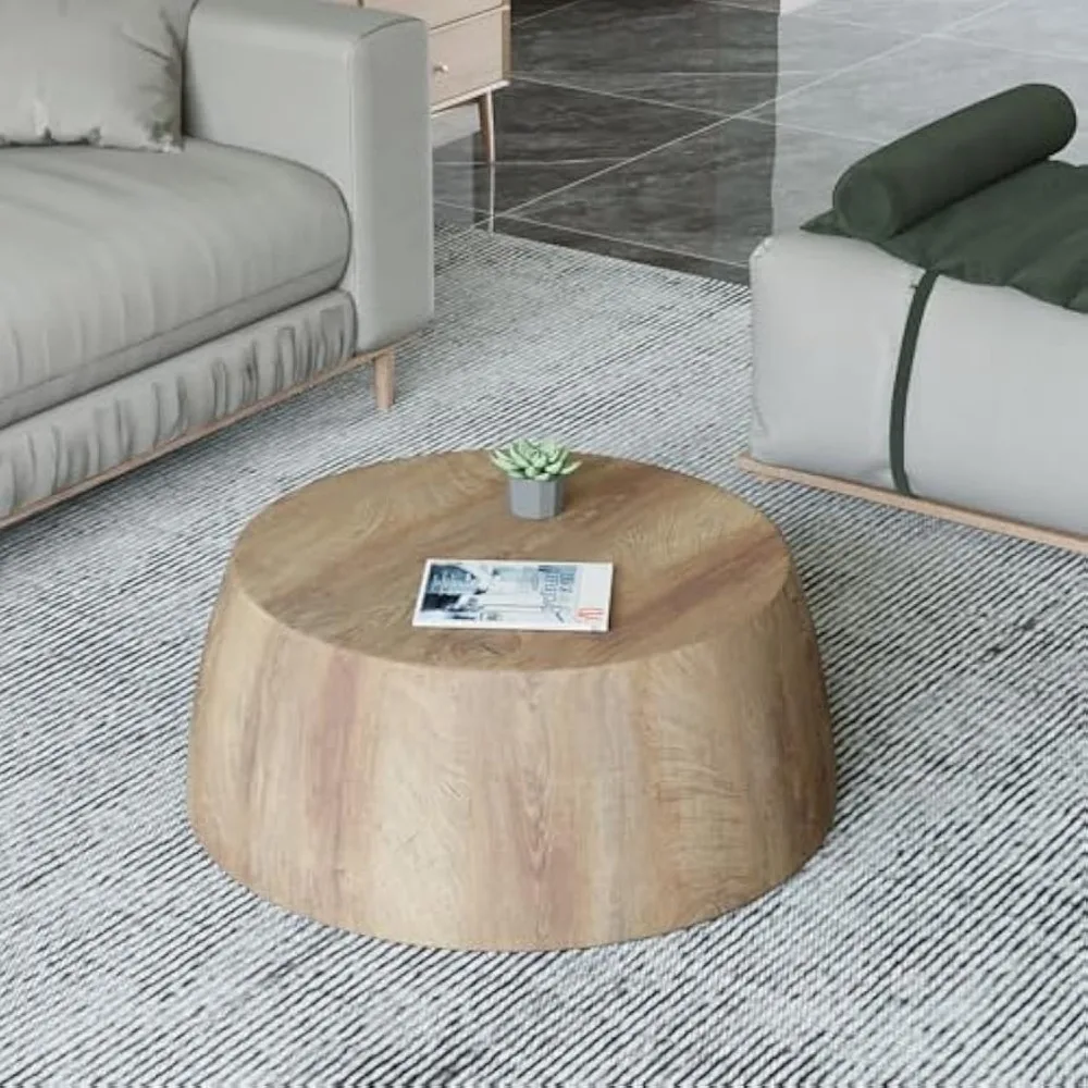 Drum Coffee Table, Modern Industrial Wooden 29.53″ Round Coffee Table, Natural Wood