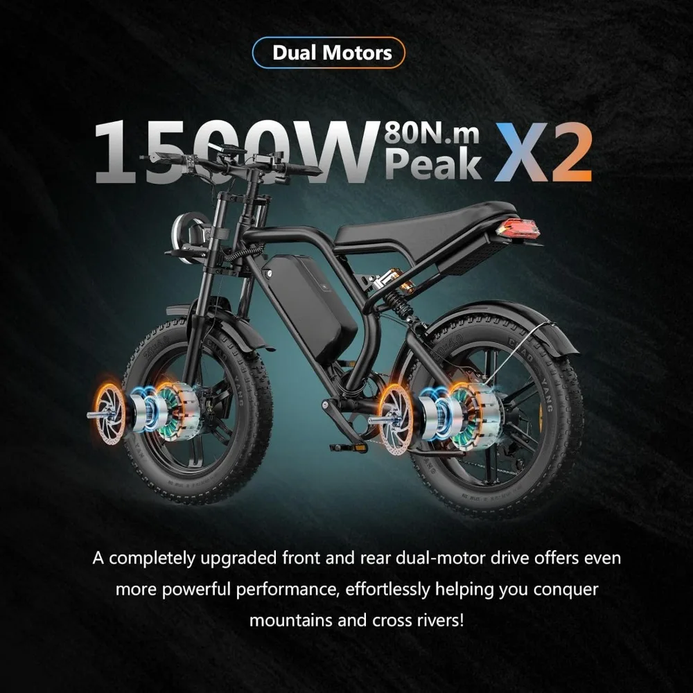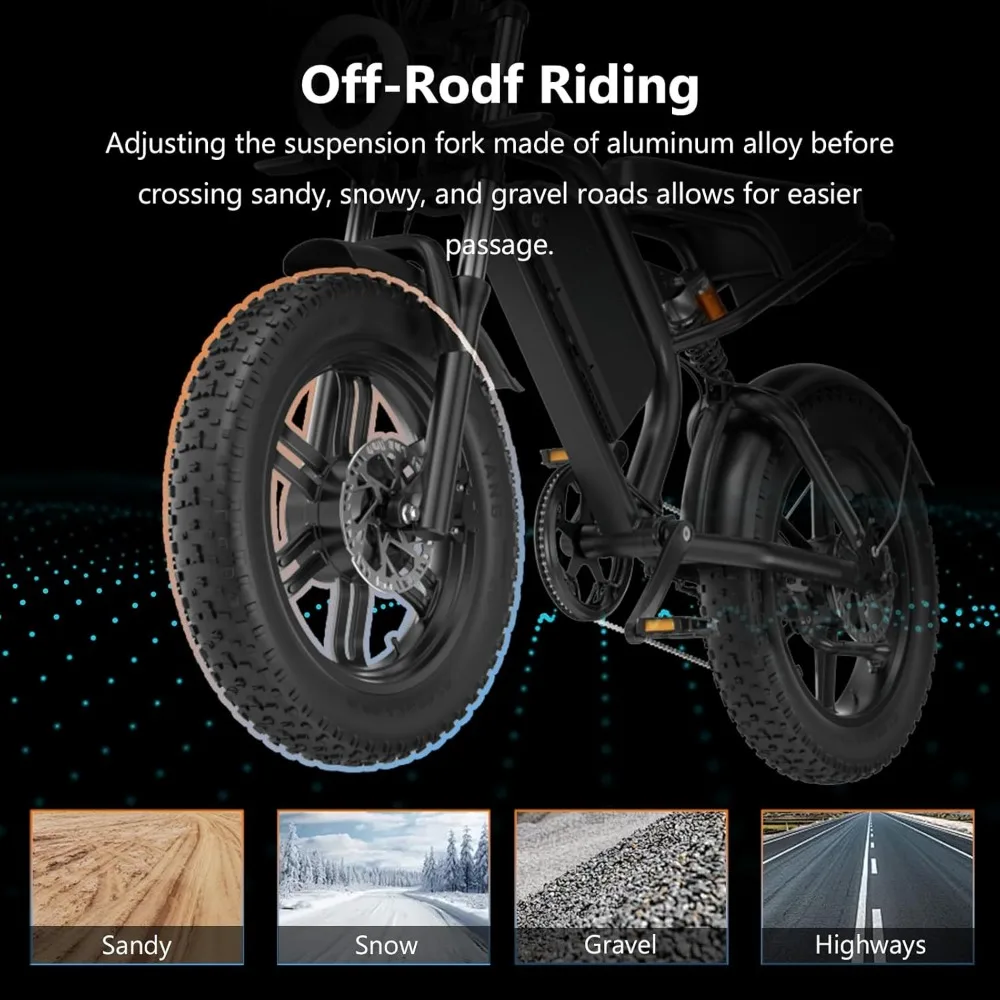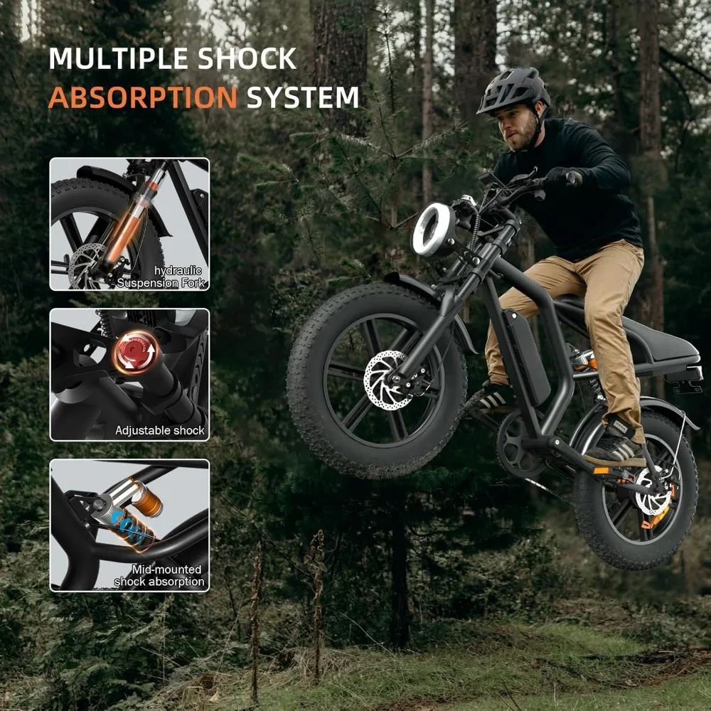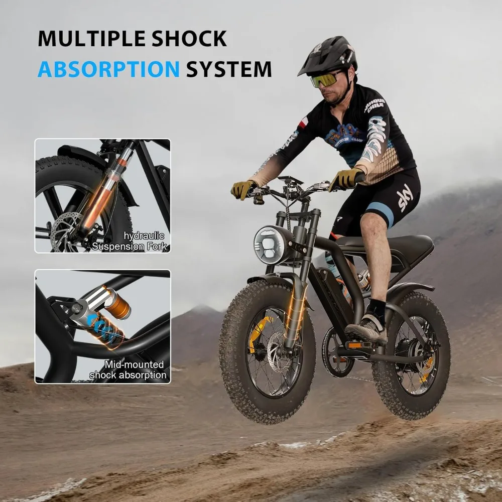 - 【Safety and Stability for Optimal Riding Experience 】 Our Dirt Electric Bike for Adults features a 5-stage full suspension system including two fork spring dampers, a seat spring damper and two 20 ” puncture-proof fat tires that absorb shocks and bumps. Conquer all terrains with confidence. Dual disc brake system reduces braking distance for safer and more reliable riding even in extreme weather conditions