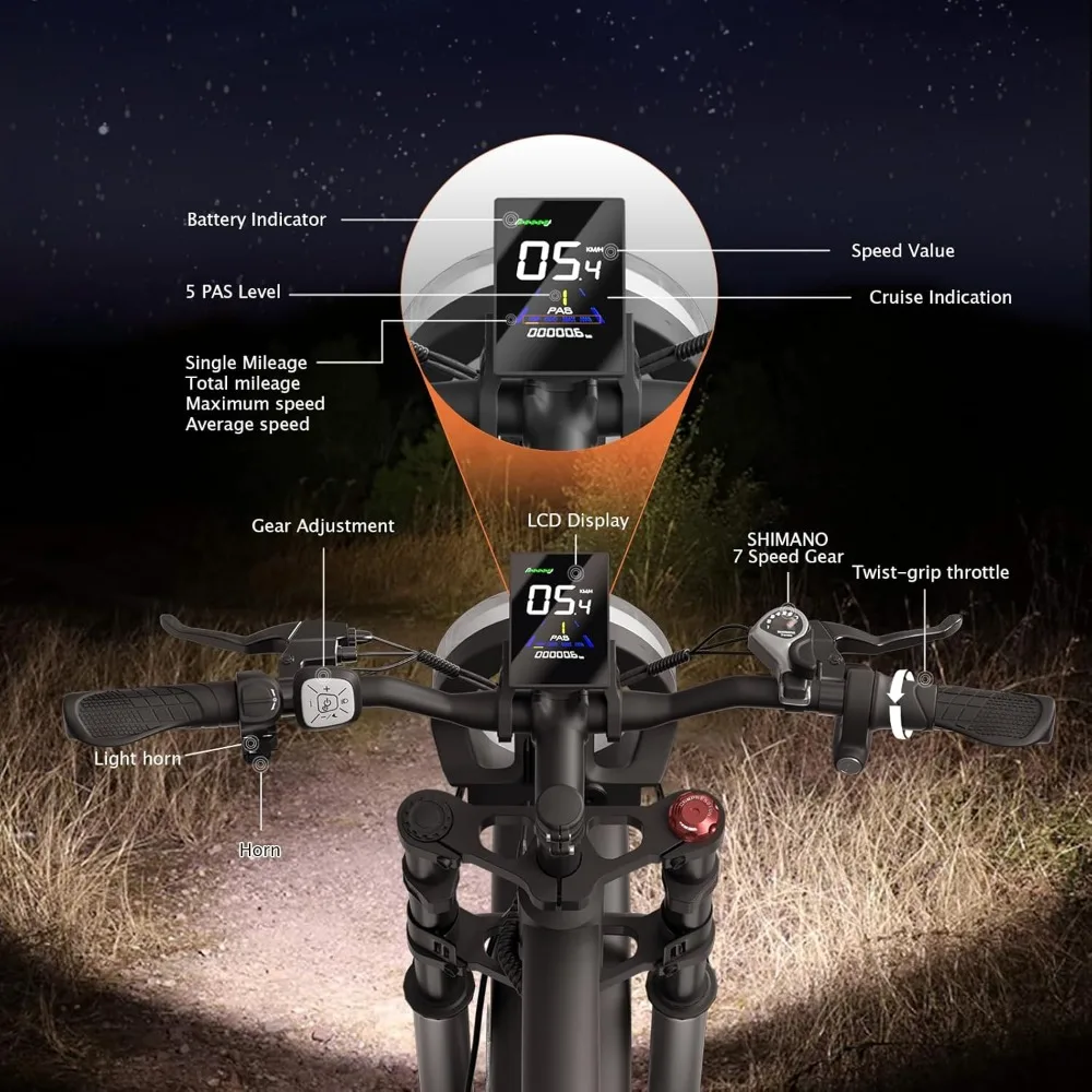 - 【3 Modes+7-Speed 】Electric mountain bikes for adults have 3 modes, including electric, pedal assist and ordinary bicycle modes. You can choose modes based on your situation or preferences to achieve a safe, comfortable, healthy, and energy-efficient travel experience. The 7-Speed function allows you to easily navigate various terrains and complete exciting off-road trips with ease