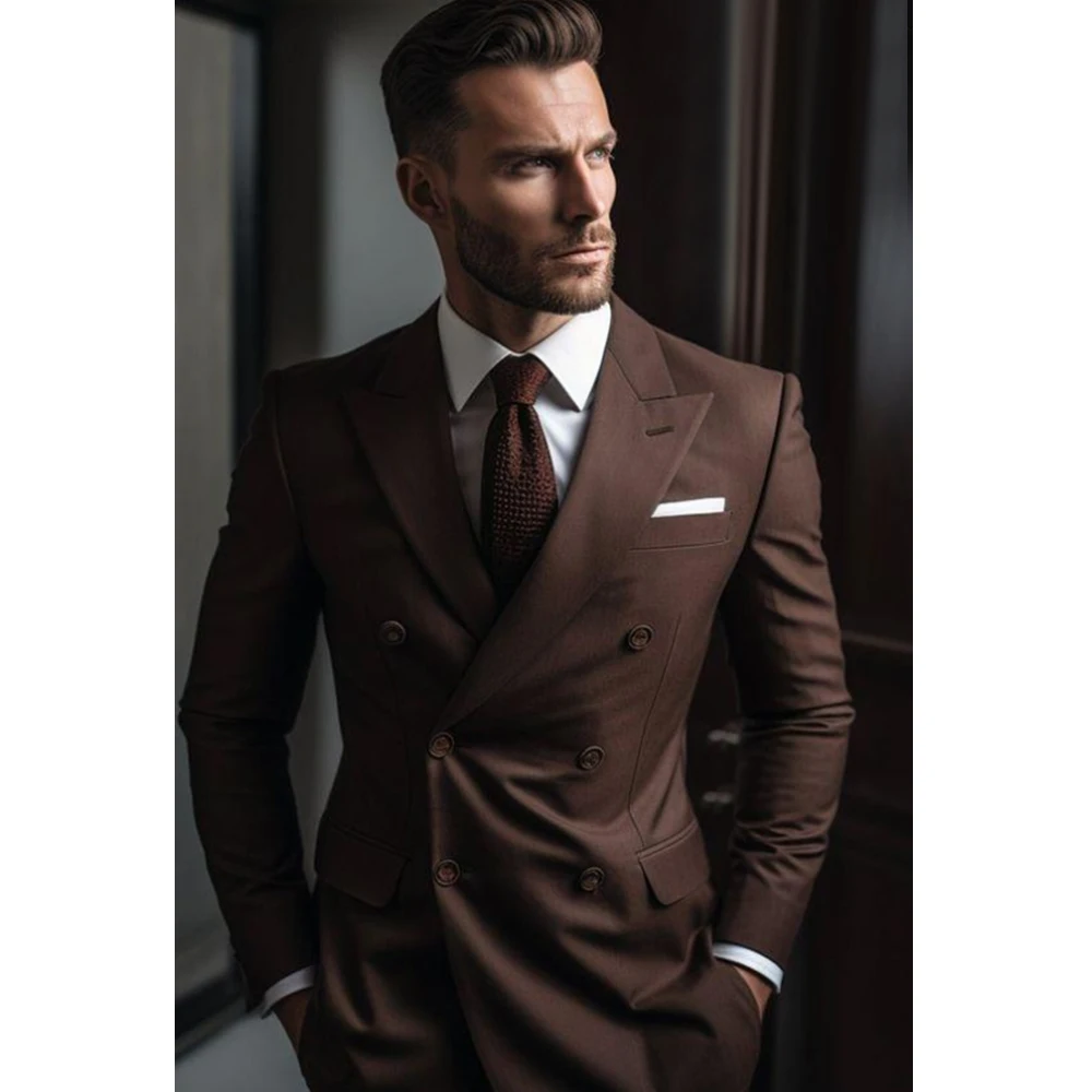 Elegant Brown Suit for Men 2 Piece (Jacket+Pants) Double Breasted Costume Homme Slim Fit Formal Gentleman Business Blazer Set