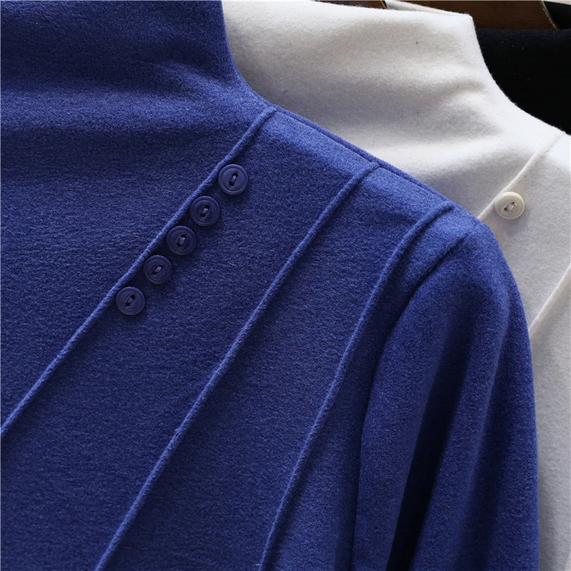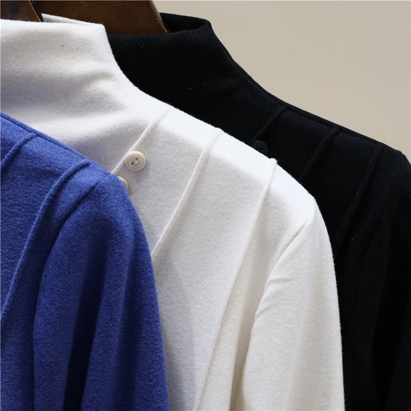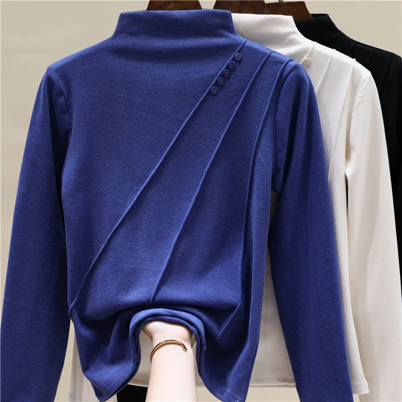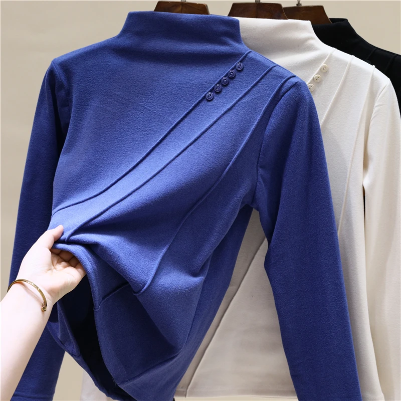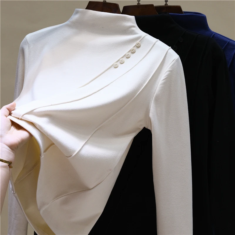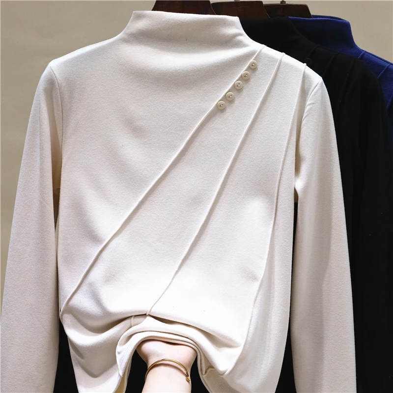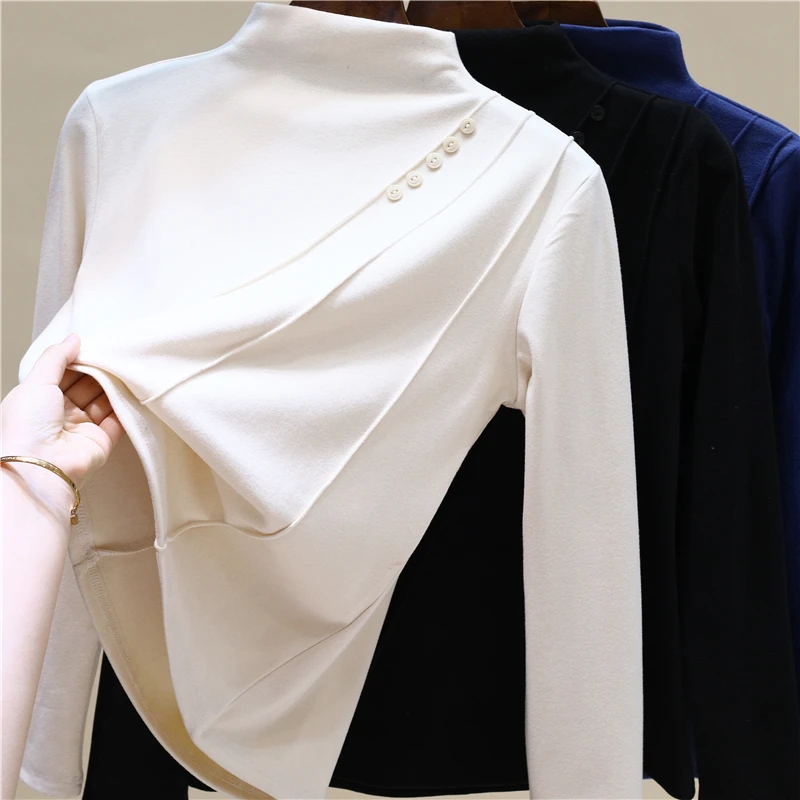 Elegant Long Sleeve Vintage Half High Collar Chic Asymmetrical Slim Top Office Lady High Street Autumn Winter Plus Size T-Shirts