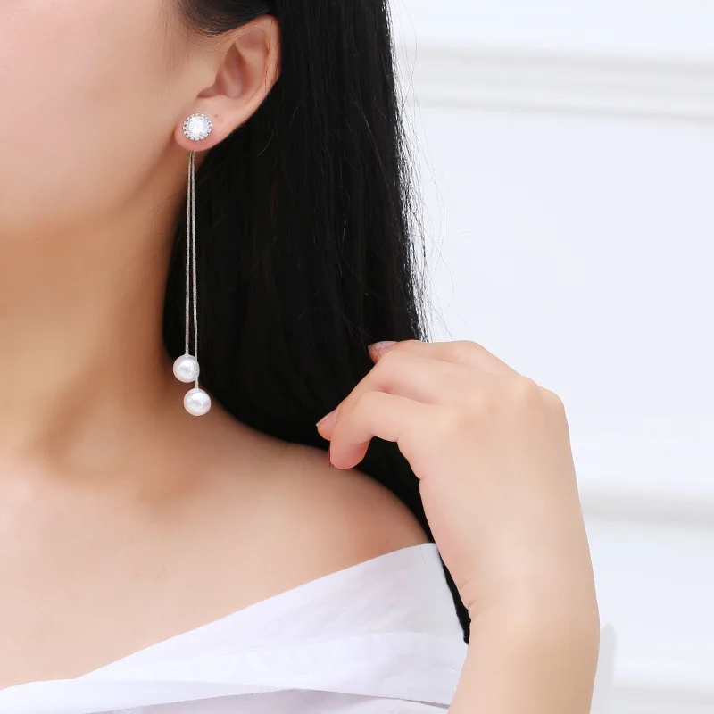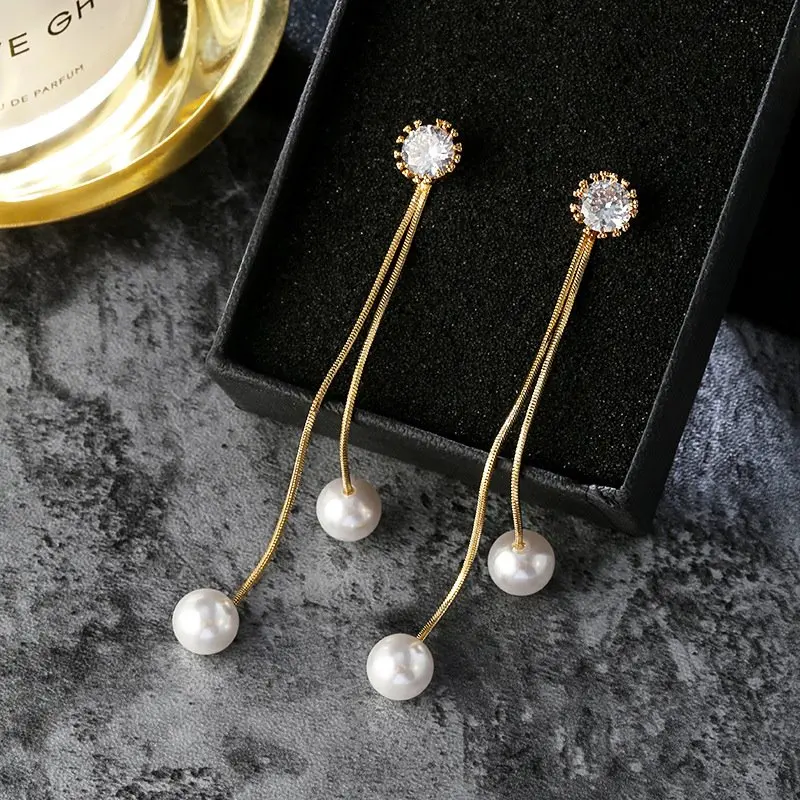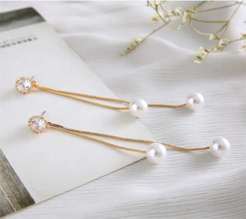 Elegant Pendientes Flecos Women Long Earring CZ Pearl Charm Pendent Snake Chain Tassel Ear Bridal Wedding Jewelry