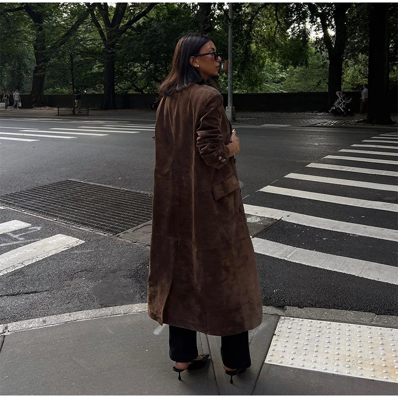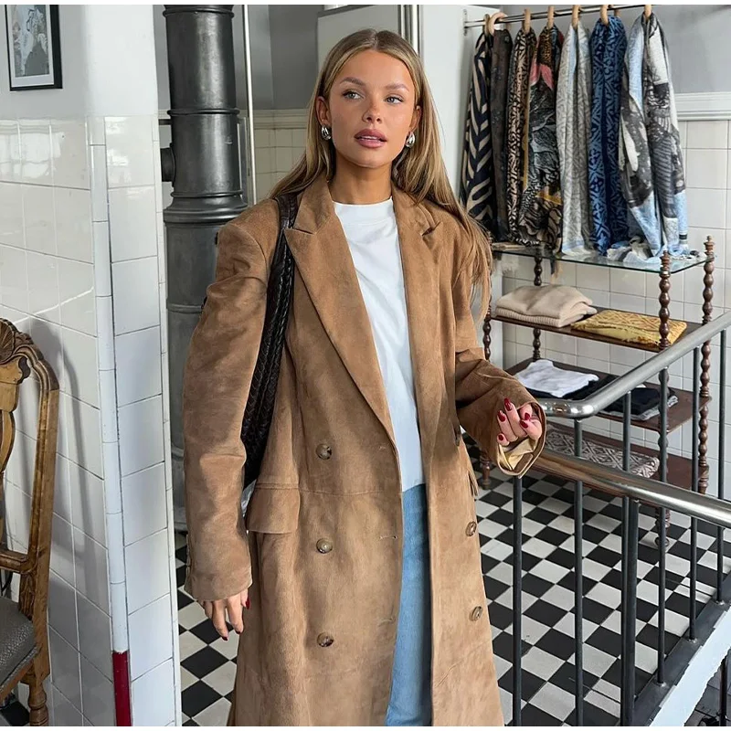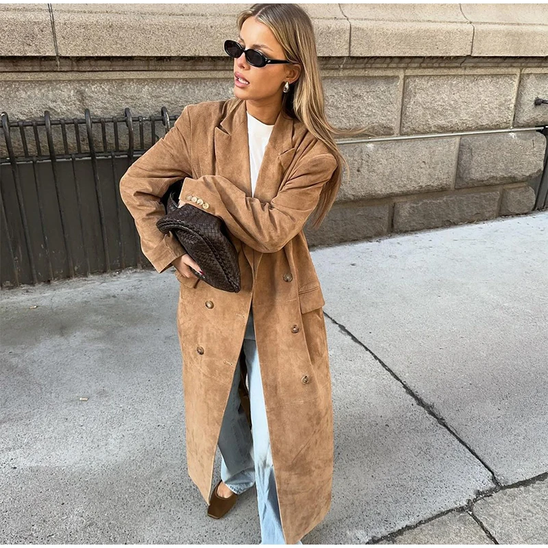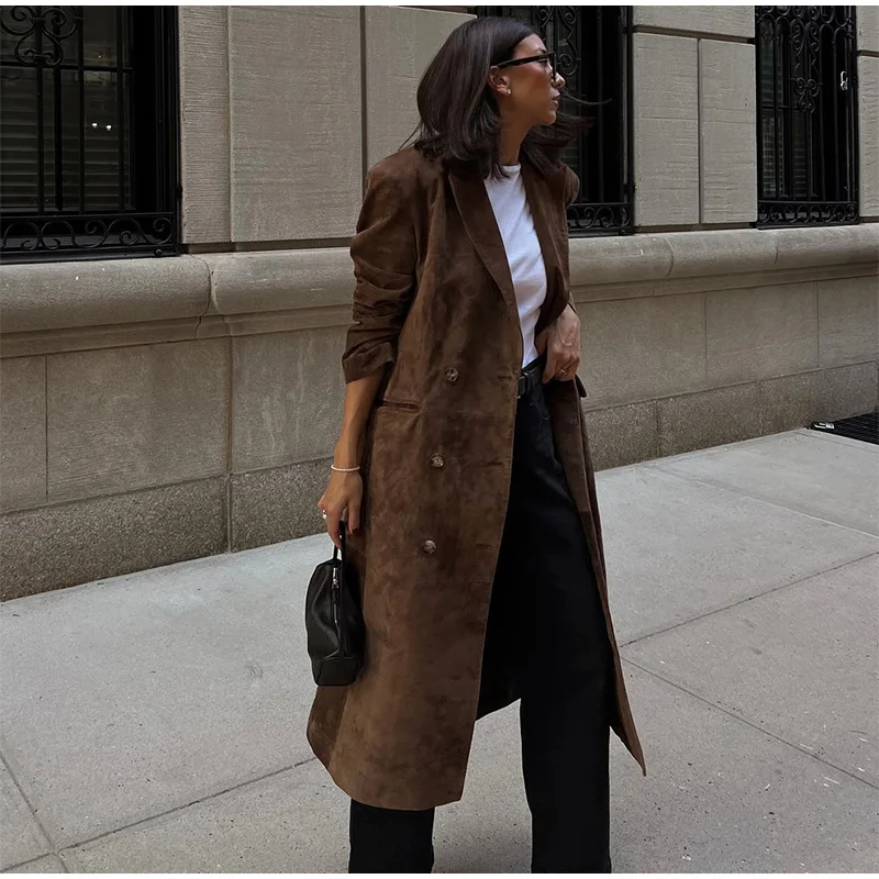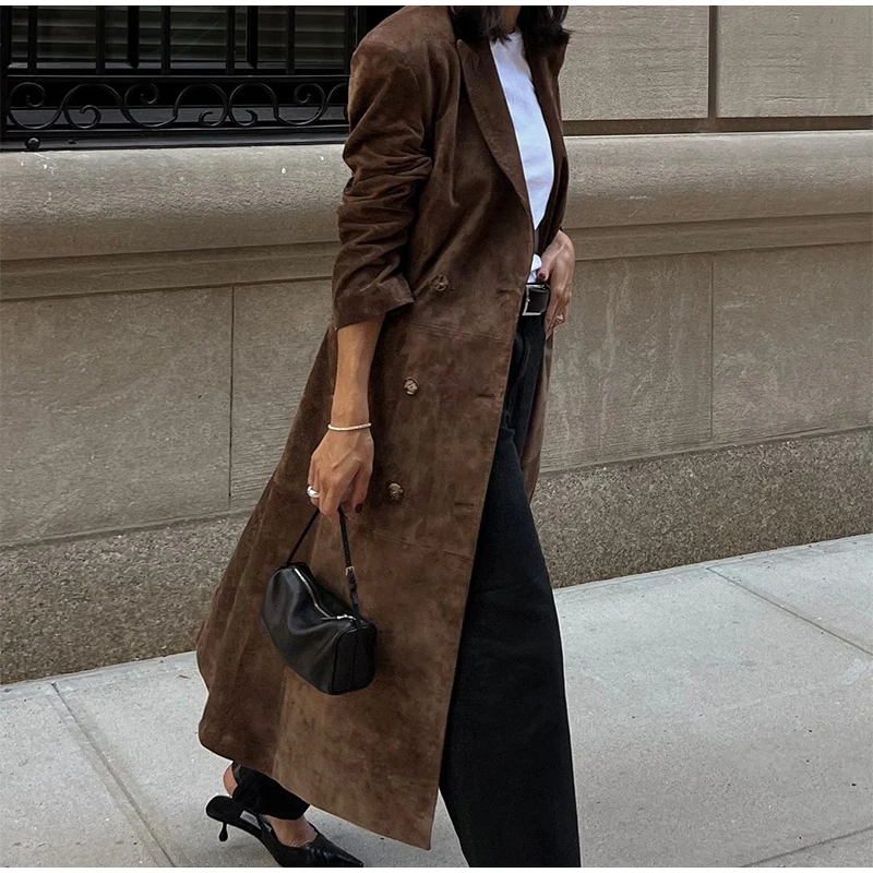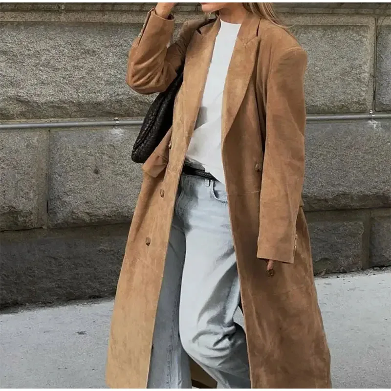 Elegant Suede Leather Women Long Windbreaker Coats Chic Lapel Double Breasted Lady Oversized Jackets 2024 Autumn Street Outwears