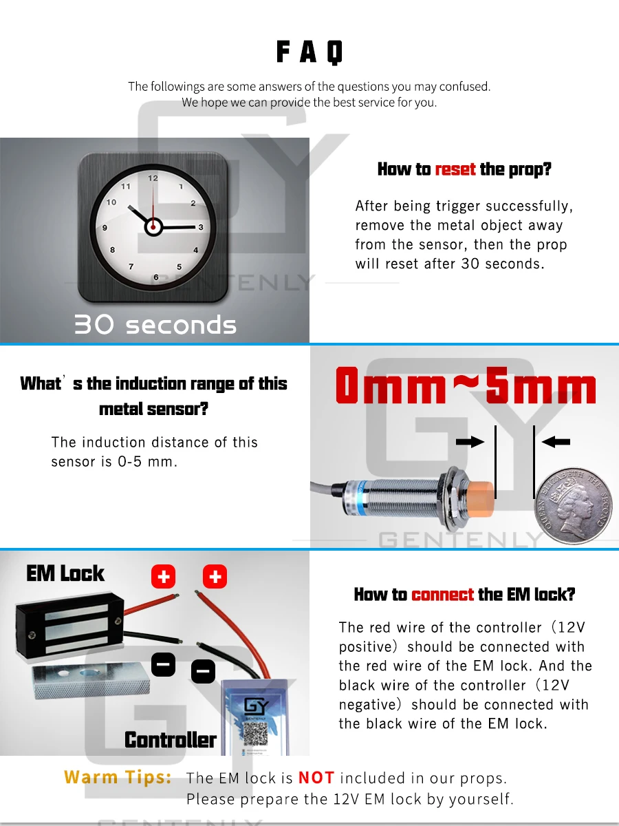 There are three metal sensors installed in the room. Only metal objects can be detected by these sensors.Players need to find something metallic at first,and then get the correct trigger sequence. When then three metal sensors are touched by metal object in right sequence, the lock will open.
