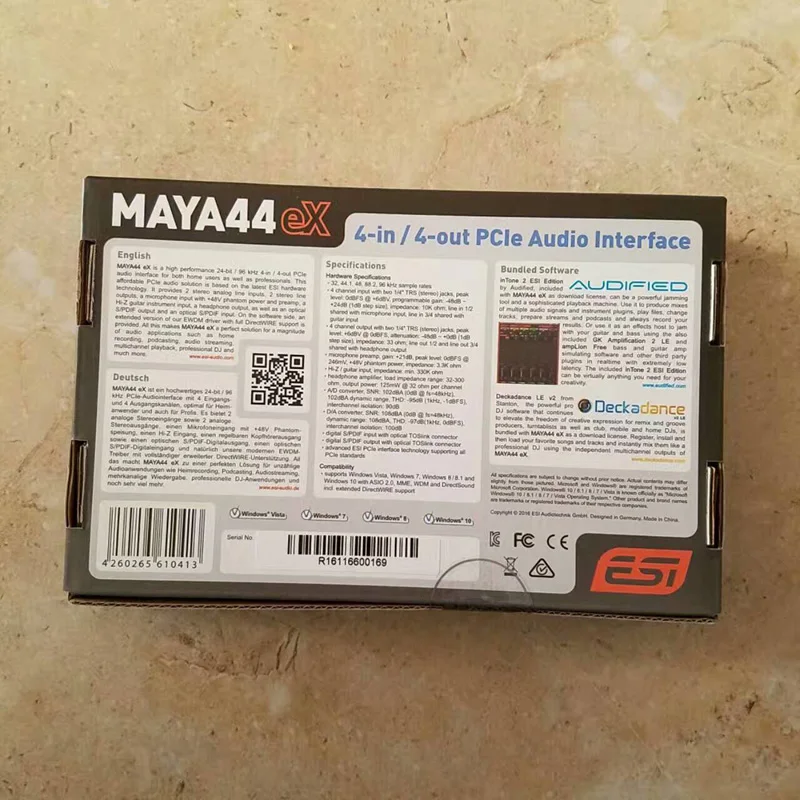 The MAYA44 eX works on 32-bit or 64-bit systems with Windows Vista, Windows 7, Windows 8.1 and Windows 10. Comes with a powerful software package. Including the special version of inTone 2 ESI from Audified, a very powerful effects host software that can process and record audio in real-time using a third-party VST plug-in or the included ampLion Free and GK Amplification 2 LE. Also comes with high-quality DJ software: Stanton's Deckadance LE.