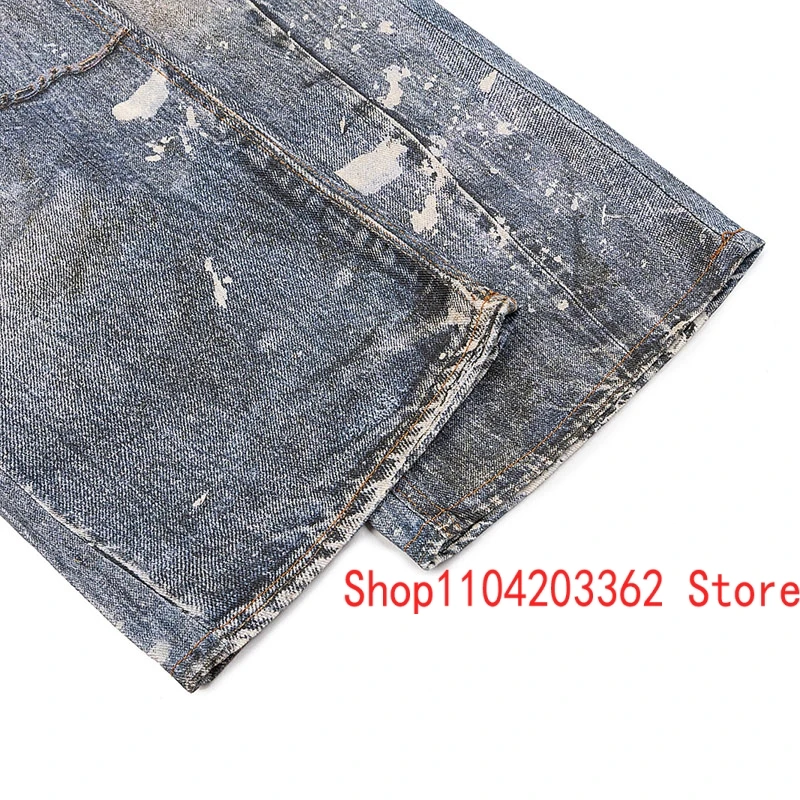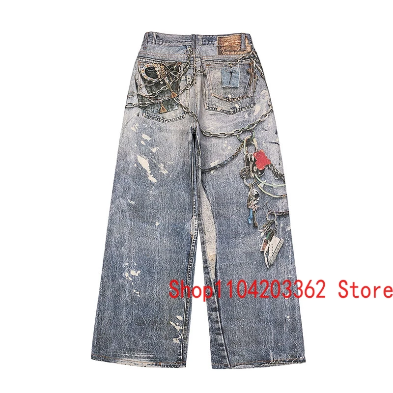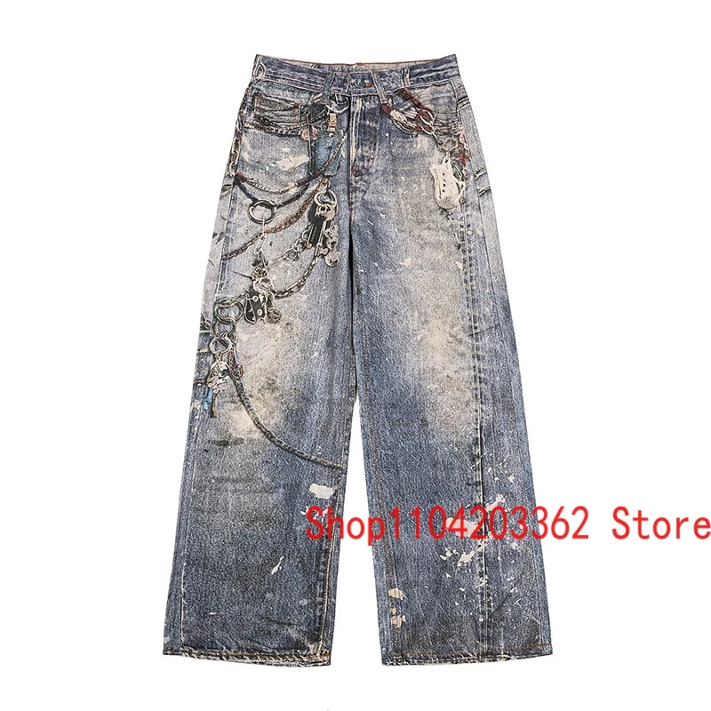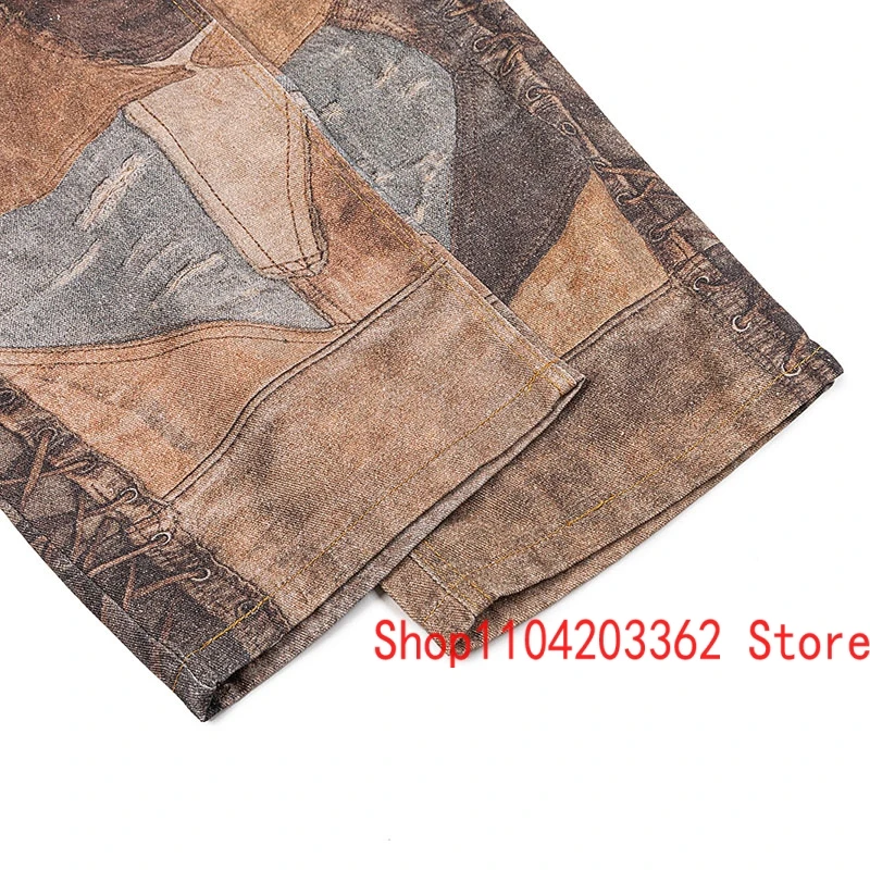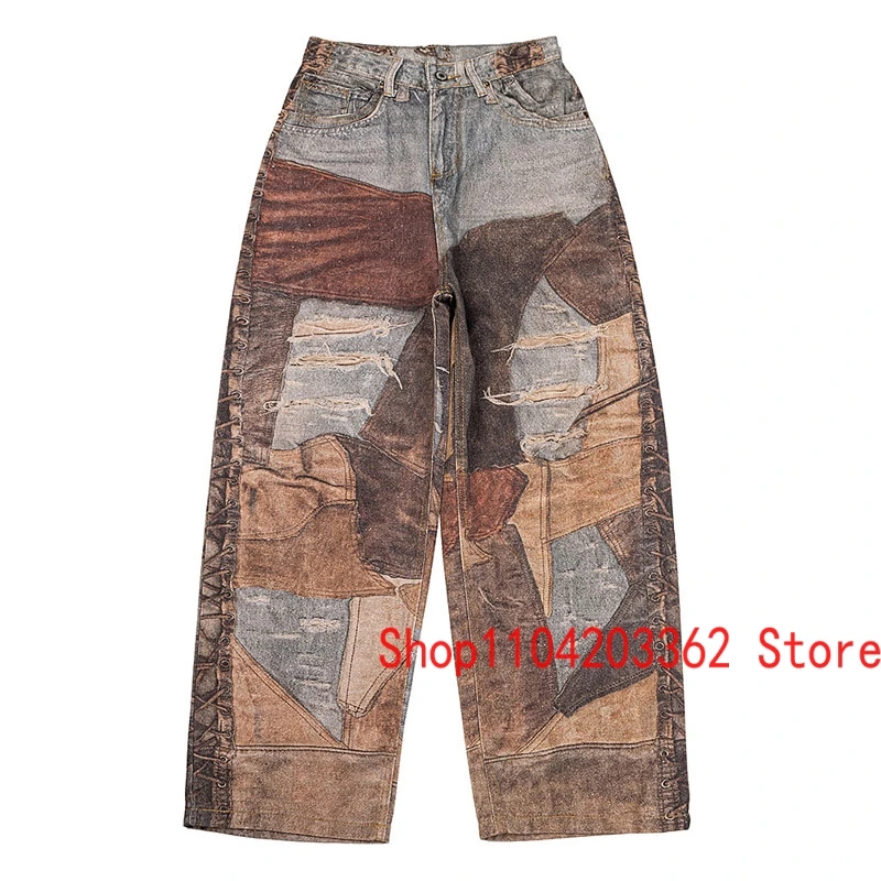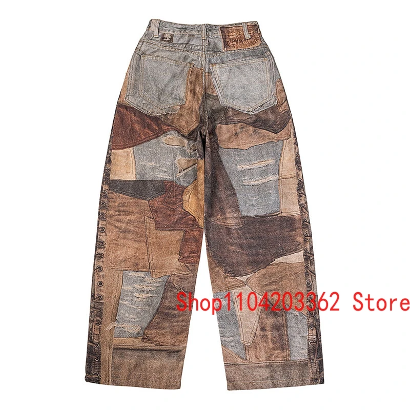Europe American Streetwear Kanye West Jeans Men Women Hip Hop Loose Straight Pants Vintage Patchwork Ripped Denim Trousers