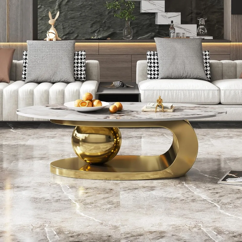 Exquisite Modern Oval Stone Coffee Table With Abstract Gold Metal Base – Perfect Centerpiece for Stylish Living Rooms-Gold Desk