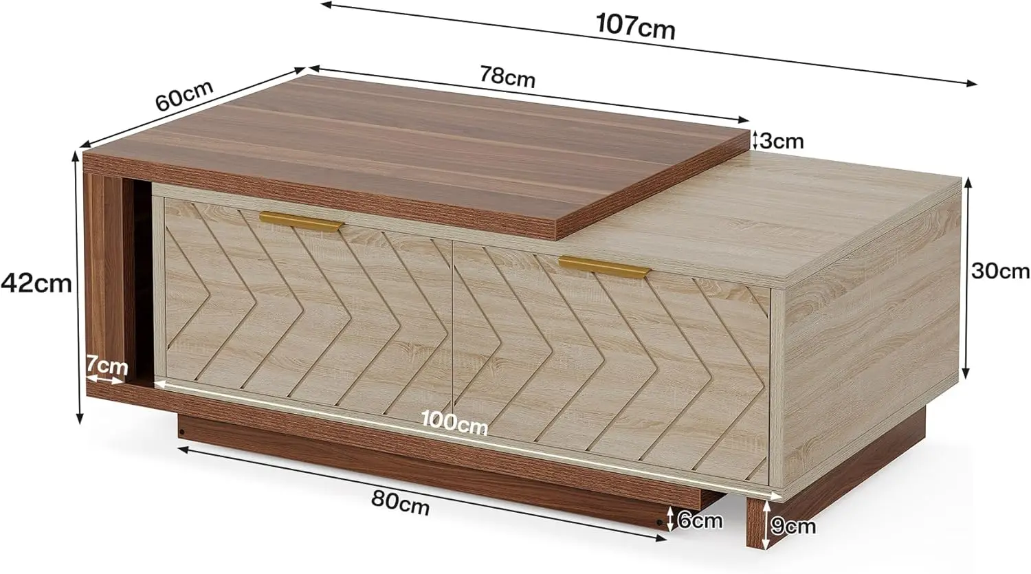 - Sophisticated Dual-Tone Design: The coffee table is expertly crafted with a distinctive blend of warm walnut and cool oak veneers. This sophisticated dual-tone design creates a visually pleasing contrast that adds warmth and depth to your space. Suited to a range of interior styles, this coffee table makes a striking statement that draws in the eye.