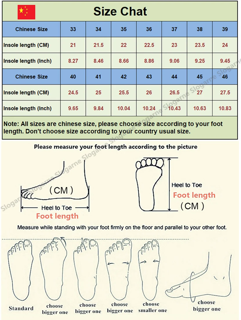 All sizes are Chinese size, not European size, please choose size according to your foot length, don’t choose size according to your country usual size; It’s better to choose one size larger if your foot is a liitle wide, or your instep is a bit high; please study our Size Chat before you make orders , thanks!