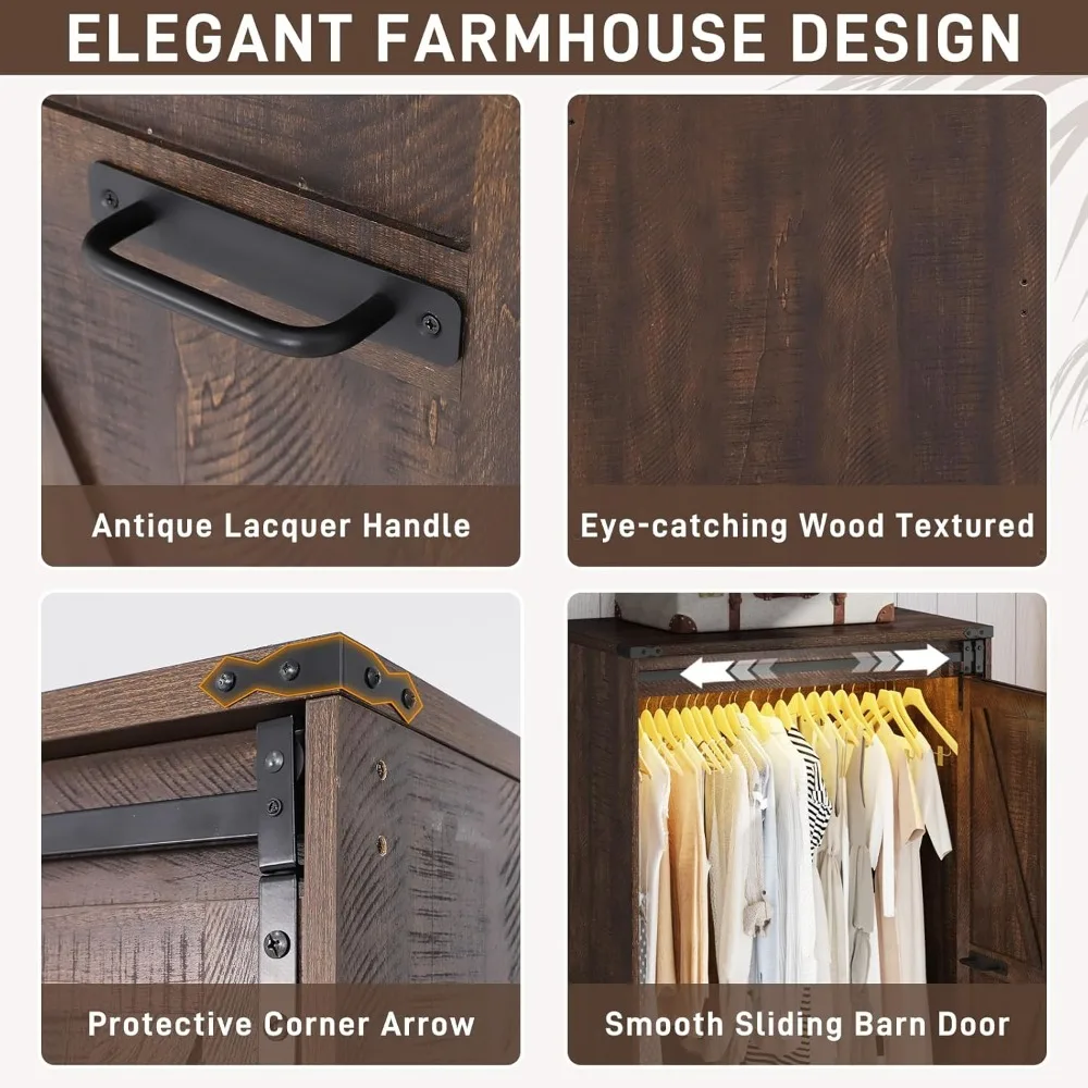 - Farmhouse Wardrobe with Sliding Barn Door: Our wardrobe featuring with sliding barn doors ensures a seamless and quiet glide, giving you easy access to your clothes.You can slide to left or right,it’s all up to your choice. It is not only more convenient than other cabinet doors but also offers a unique elegant twist on farmhouse design, blending effortlessly with any home décor.