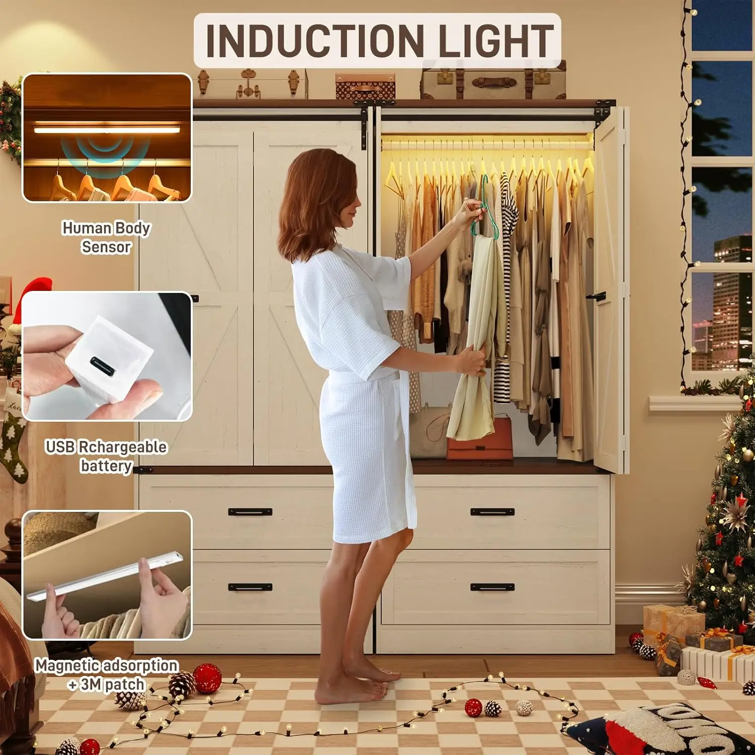 - 2 Door Wardrobe Closet with Motion Sensor Light: Our led wooden wardrobe closet come with induction light which will turn on automatically when you get within 120° and 16 feet, allows you to choose your clothes conveniently whether at night or low light environment.The light could be chargeable by usb cable which included in package. Auto/On/Off 3 modes available for different occasions which more bang for your buck than other closet.