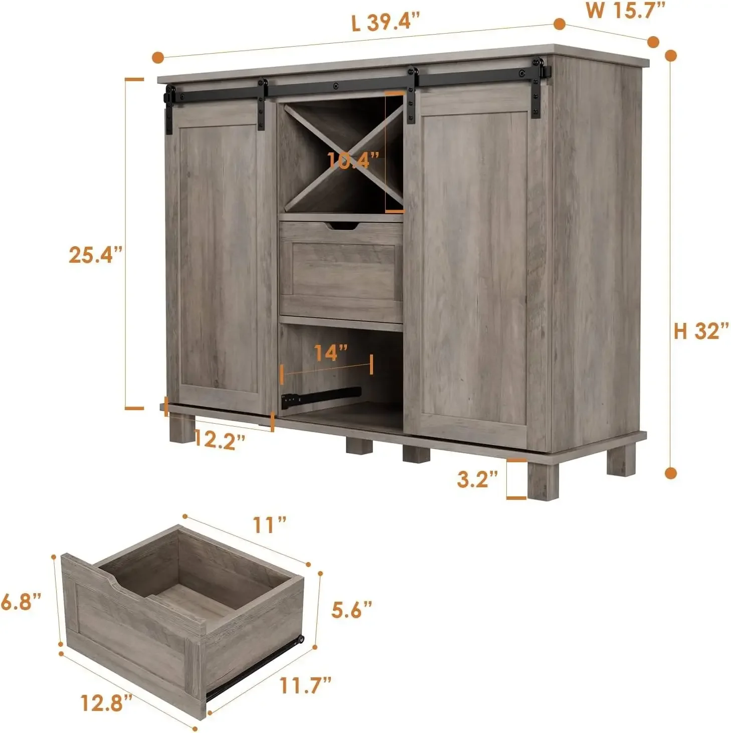 - Sturdy Structure: Crafted from premium manufactured wood, this barn door cabinet can withstand the challenge of long-term use and accompany your family for years, while 6 support bases provide excellent stability. Overall size:15.7″D x 39.4″W x 32.2″H