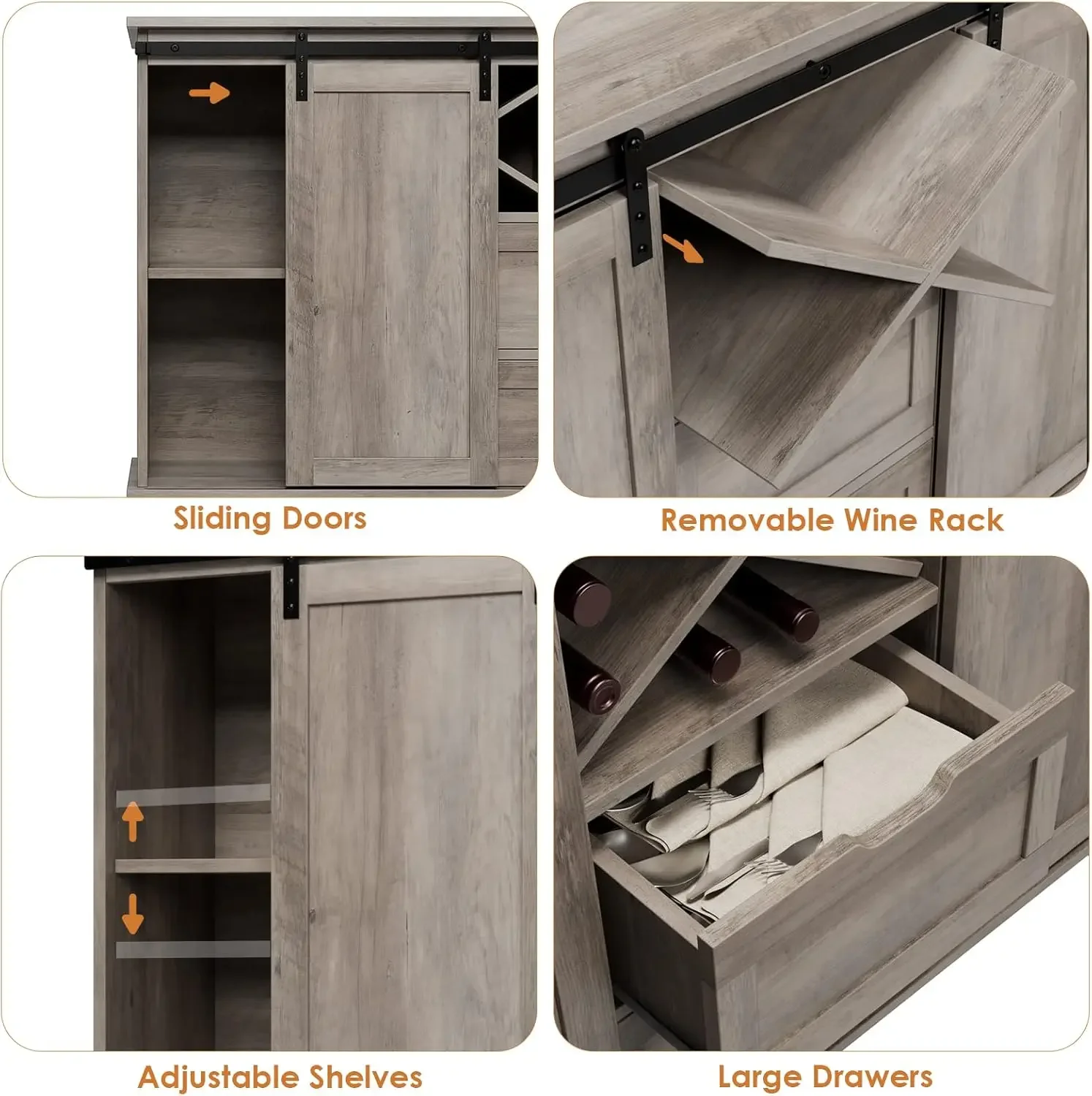 - Sliding Door Cabinet: Come with 2 drawers and 2 cabinets with adjustable shelves, the buffet cabinet provide spacious storage space to store items from utensils to your family’s favorite cookbook. Featuring removable wine rack, the coffee bar cabinet comes in handy when you’re entertaining guests and want to have plenty of wine nearby, while the wide table top allows you to take coffee makers for ease of access