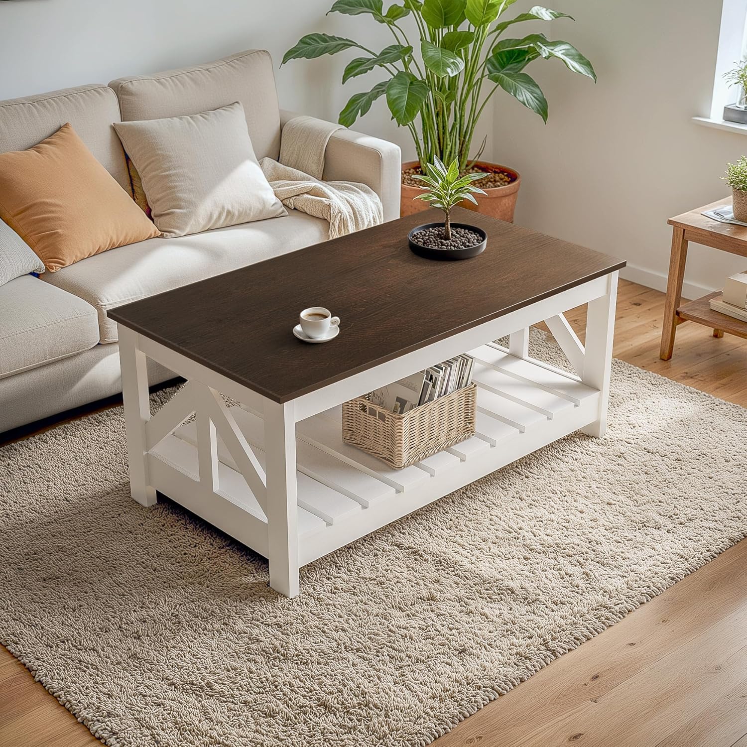 Farmhouse Coffee Table, Wood Square Open Storage Compartment For Living Room, Brown And White