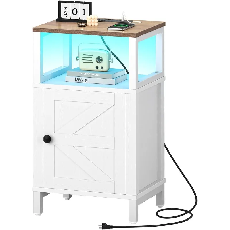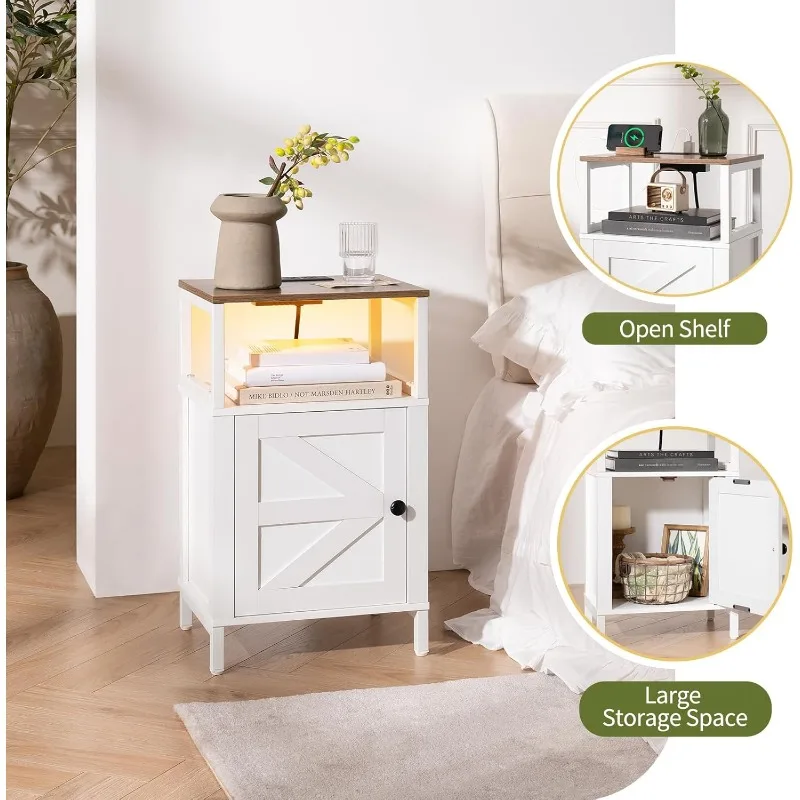 Farmhouse Nightstand with Charging Station, Wood Night Stand End Table with USB Ports, LED Bed Side Table with Storage Cabinet,
