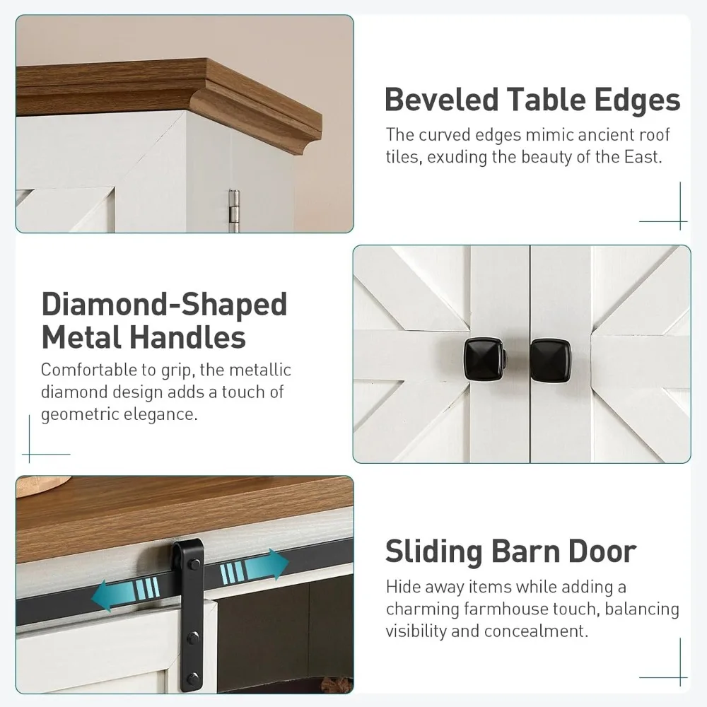 - Farmhouse Style: The white frame harmonizes with the walnut-colored top, while the eaves design at the top and the angled cut design at the bottom add a unique charm. The black metal details enhance the classic warmth of the cabinet while maintaining a modern sense of fashion