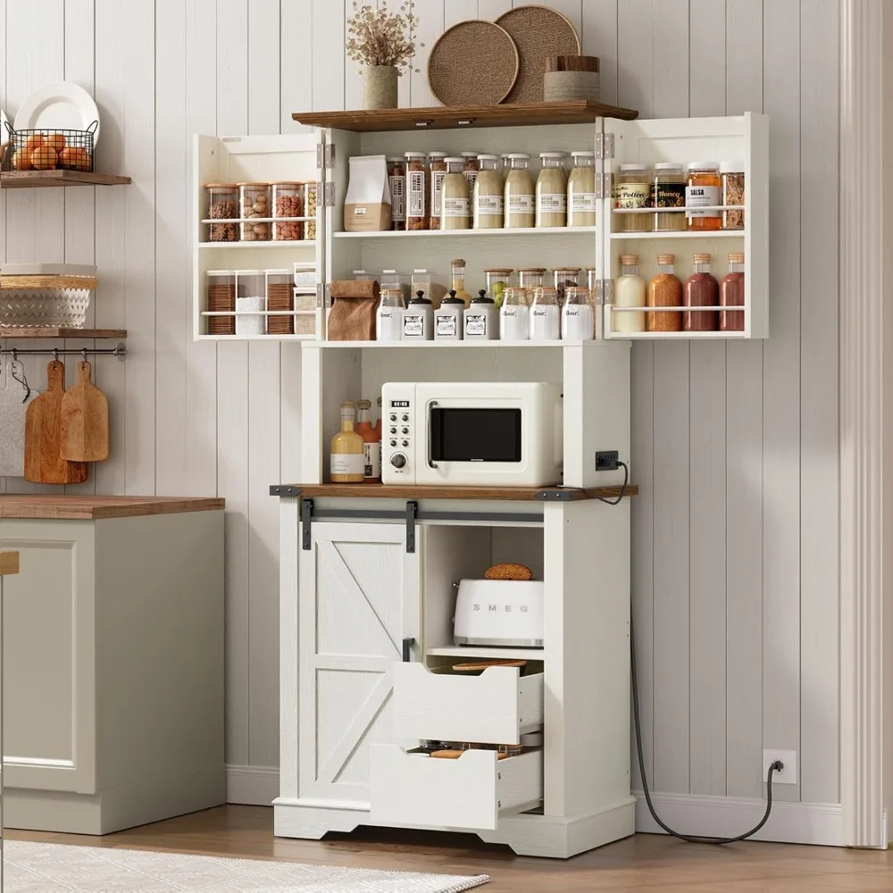 Farmhouse Pantry Cabinet with Charging Station, Kitchen Pantry with 2 Drawers & Sliding Barn Door, Tall Wooden Storage Cabinet,