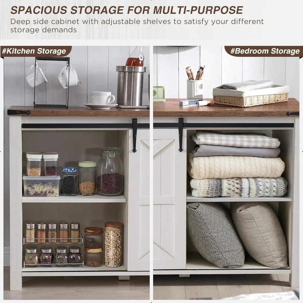- ADDED CONVENIENCE: Say goodbye to kitchen and dining room clutter with our farmhouse versatile buffet cabinet. Featuring 2 sliding barn doors ensures a seamless and quiet glide, giving you easy access to your essentials, inside, you’ll discover each deep side cabinet with an adjustable shelf that can accommodate items of various sizes flexibly. It offers plenty of space on top for coffee makers or microwaves, along with 4 smooth-glide roomy drawers for organizing tableware and more.