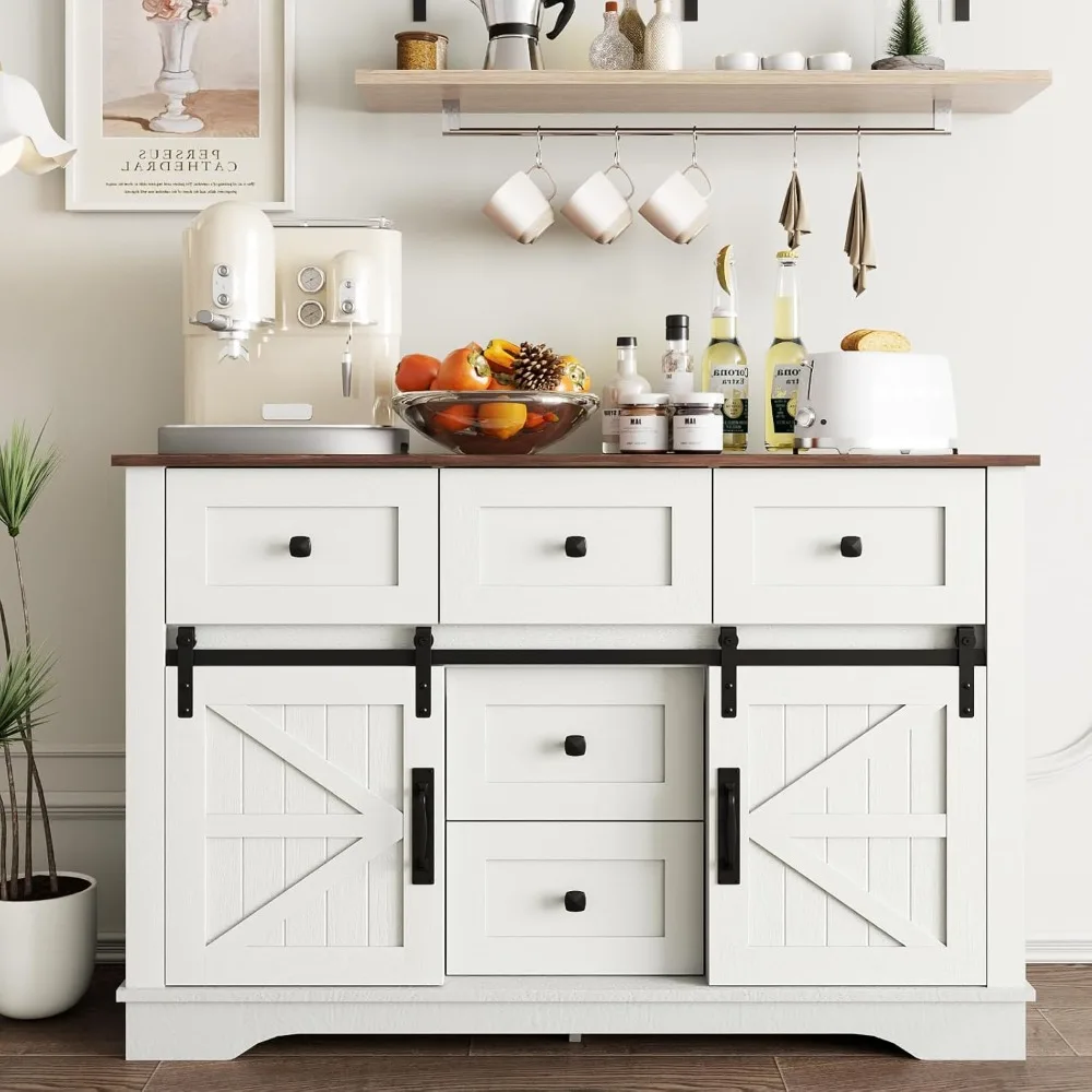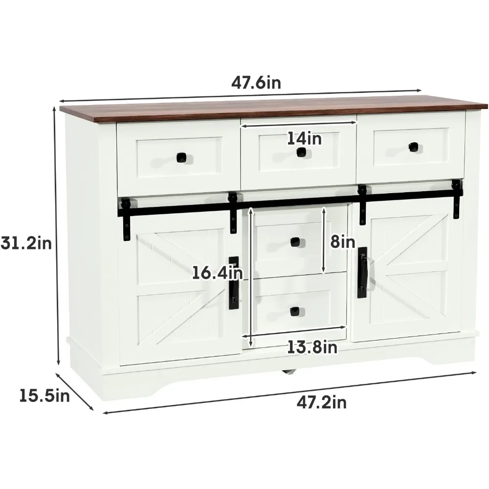 Farmhouse Sideboard Buffet Cabinet with Storage, Large Kitchen Sideboard Cabinet, Sliding Barn Doors and 5 Drawers